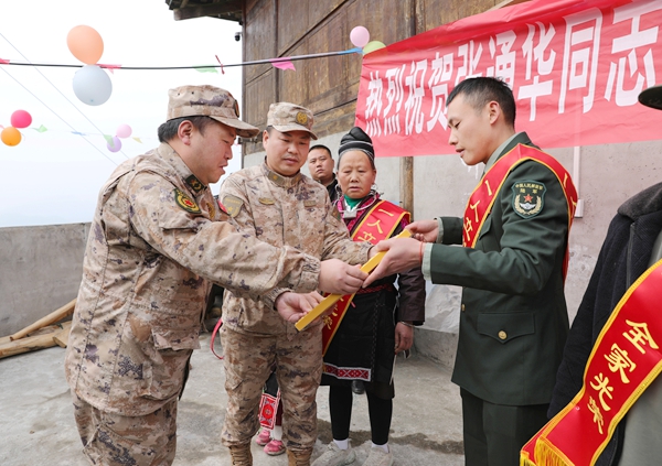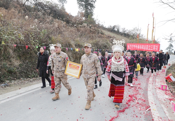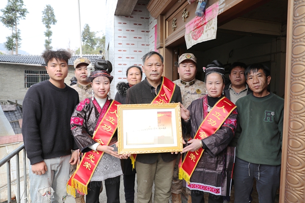 在巫泥村村口,乡亲们身着民族盛装,吹响芦笙,共同庆祝这个难忘的时刻。工作人员手捧“三等功”牌匾,高举“热烈祝贺张通华同志荣立三等功”的横幅,一路护送至张通华家中。家属早已在门前等候,喜悦与自豪之情溢于言表。