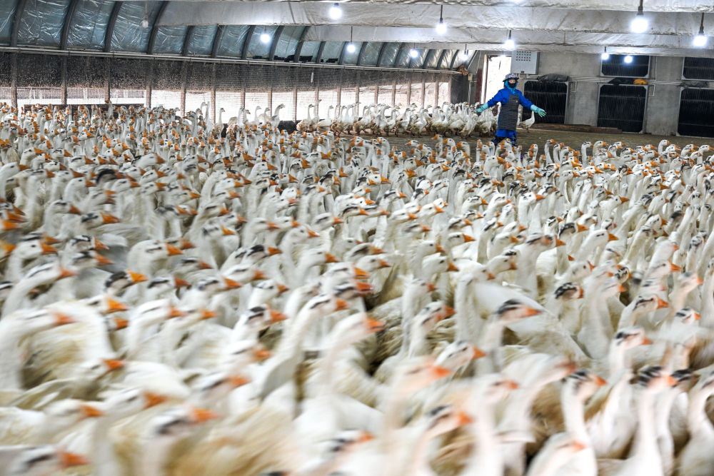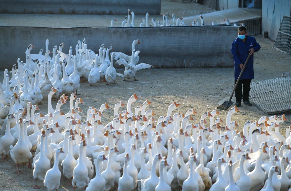 ↑工人在贵州省锦屏县新化乡欧阳村的生态鹅育雏基地管理种鹅(2026年1月21日摄)。