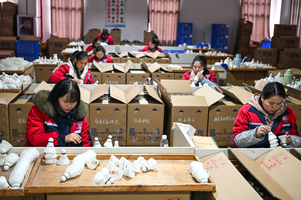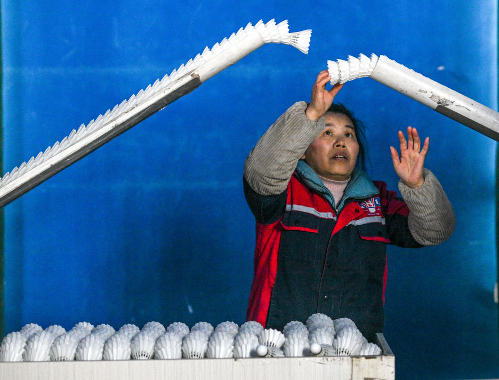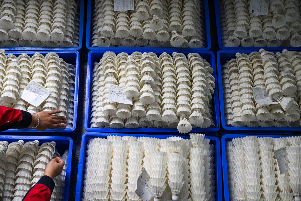 一个羽毛球的生产工序需经历洗毛、晒毛、分级、插球、成品全检等38道工序,每道工序都需要工人严格把控。