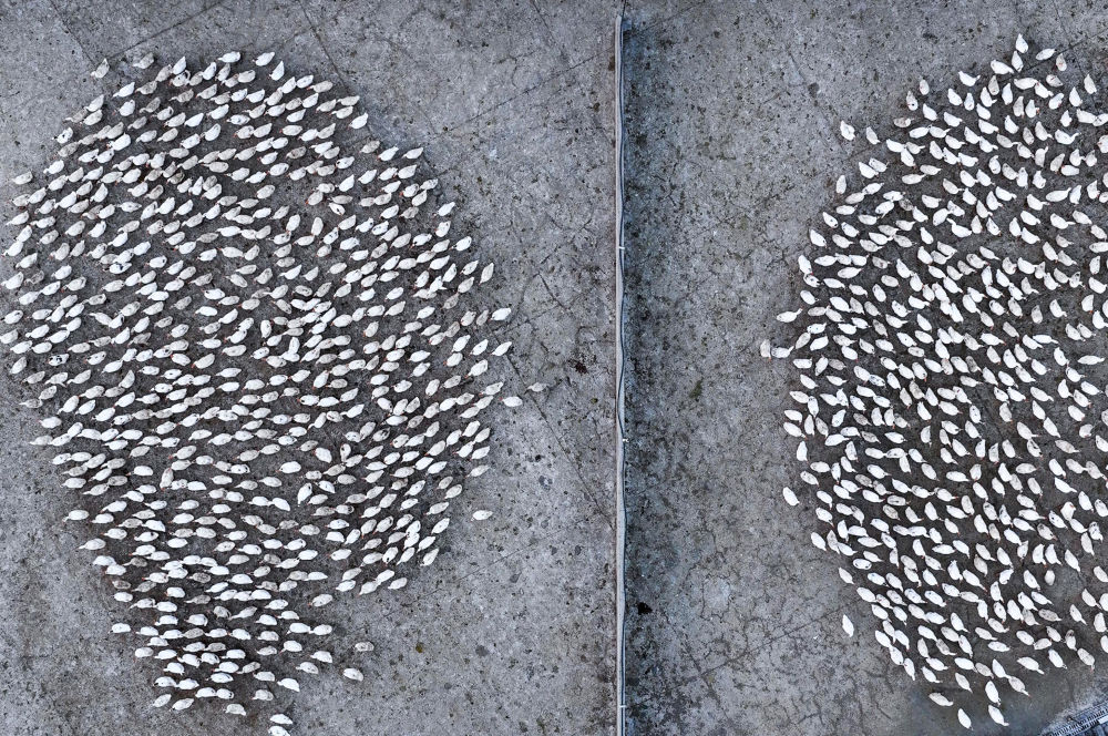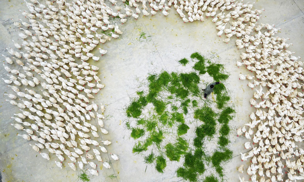↑工人在贵州省锦屏县铜鼓镇马台生态种鹅养殖基地投放草料(2020年3月11日摄,无人机照片)。