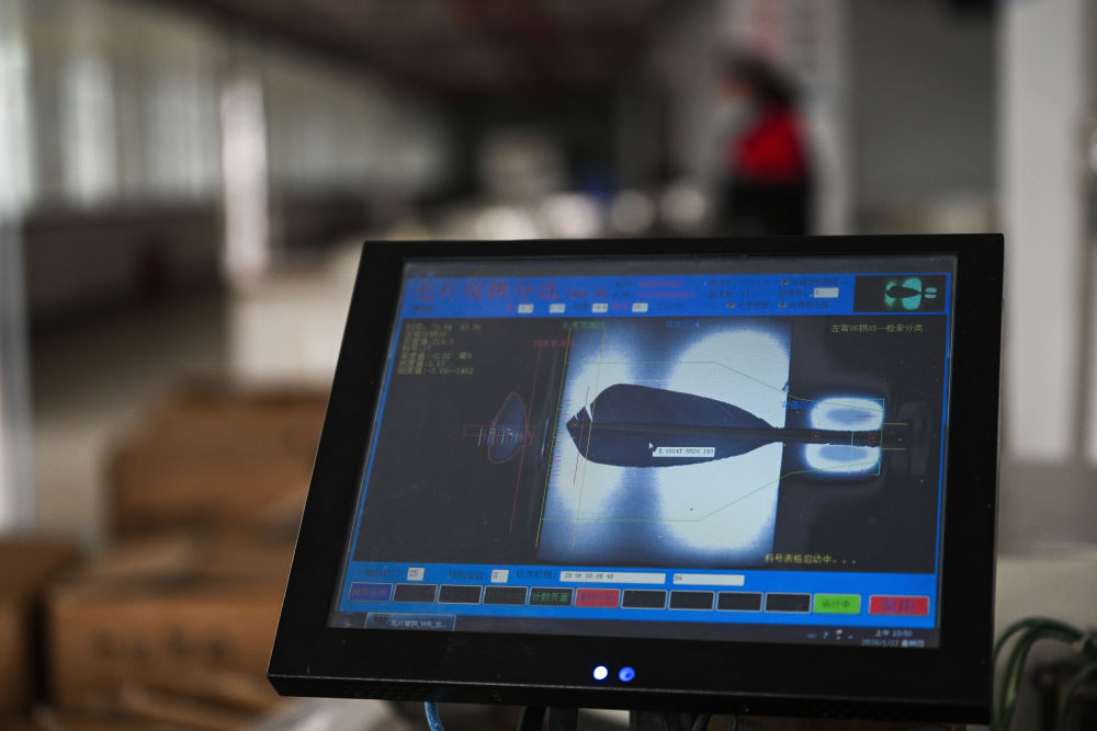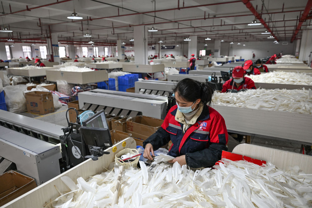 ↑工人在贵州锦屏经济开发区羽毛球生产基地分级生产羽毛球所需的鹅毛(2026年1月22日摄)。