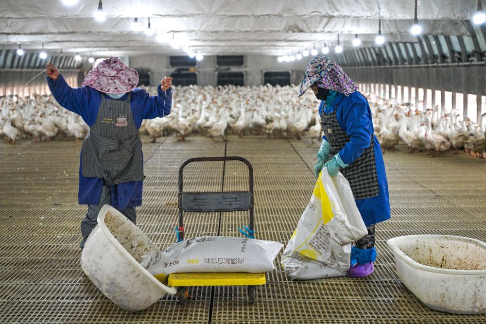 ↑工人在贵州省锦屏县新化乡欧阳村的生态鹅育雏基地给种鹅投食(2026年1月21日摄)。