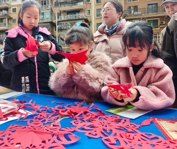 寻年味活动区则是年味十足,热闹非凡。“指尖上的年味——非遗剪纸迎新春”活动现场,150张剪纸和五把剪刀整齐摆放,居民们纷纷动手,剪出精美的窗花。孩子们在家长的陪伴下,感受着春节文化与非遗的独特魅力,亲子间的温馨互动成为一道亮丽的风景线。