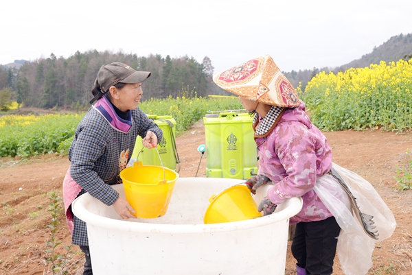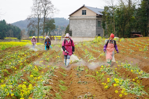 在客楼镇白家坝村清水塘组,金黄的油菜花肆意绽放,与一旁连片规整的百合基地相映成趣。田垄间,嫩绿的百合幼苗悄悄“探出头”,二十余名村民背着药箱、手持喷头,正细致地为幼苗撒药除草,忙碌的身影与烂漫春光交织,勾勒出一幅生机盎然的春管图景。