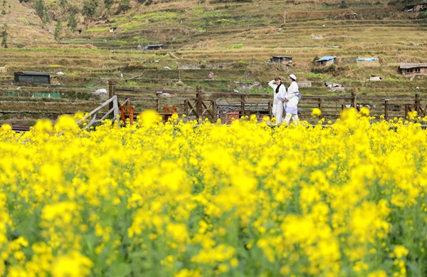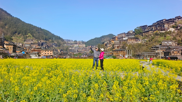 春染苗乡,万物勃发。近日,雷山县西江千户苗寨景区的油菜花迎春盛放,金黄的花海与依山而建的吊脚楼群交相辉映,吸引游客纷至沓来,赏花观景,沉浸式感受“田园+文化”的独特魅力。
