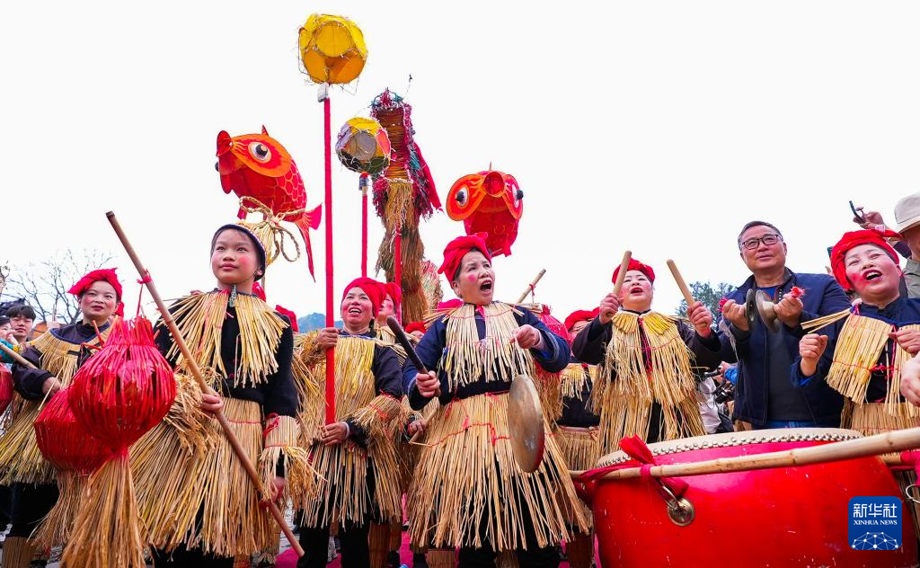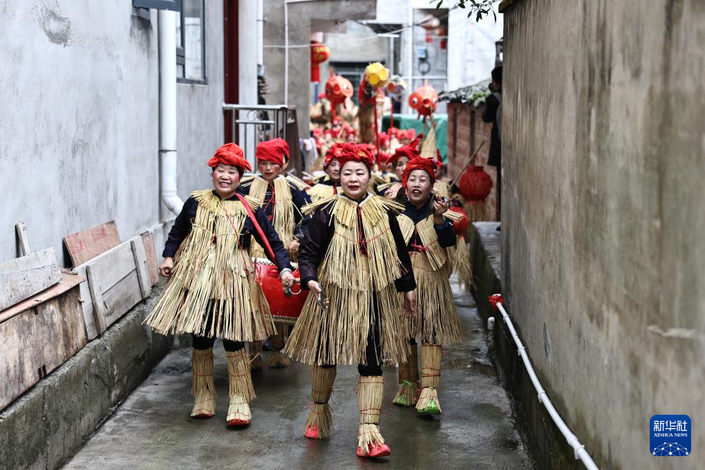 3月28日,在贵州省榕江县三宝侗寨,侗族妇女身着稻草衣参加“萨玛节”活动。新华社发(杨文舒 摄)