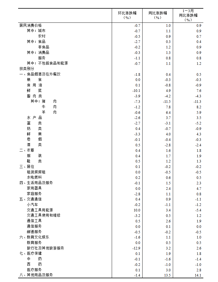 3月份,全国居民消费价格环比下降0.7%。其中,城市下降0.7%,农村下降0.5%;食品价格下降2.7%,非食品价格下降0.2%;消费品价格下降0.3%,服务价格下降1.1%。