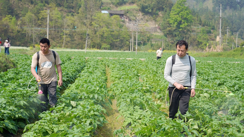 金堡镇松明村村支书杨秀才介绍道:“现在正是土豆管护关键期,我们组织村民抢抓晴好天气,做好土豆管护、病虫害防治。村里通过连片种植、统一技术指导,带动群众增收,把小土豆做成富民产业,确保今年丰产丰收,让村民的腰包更鼓。”