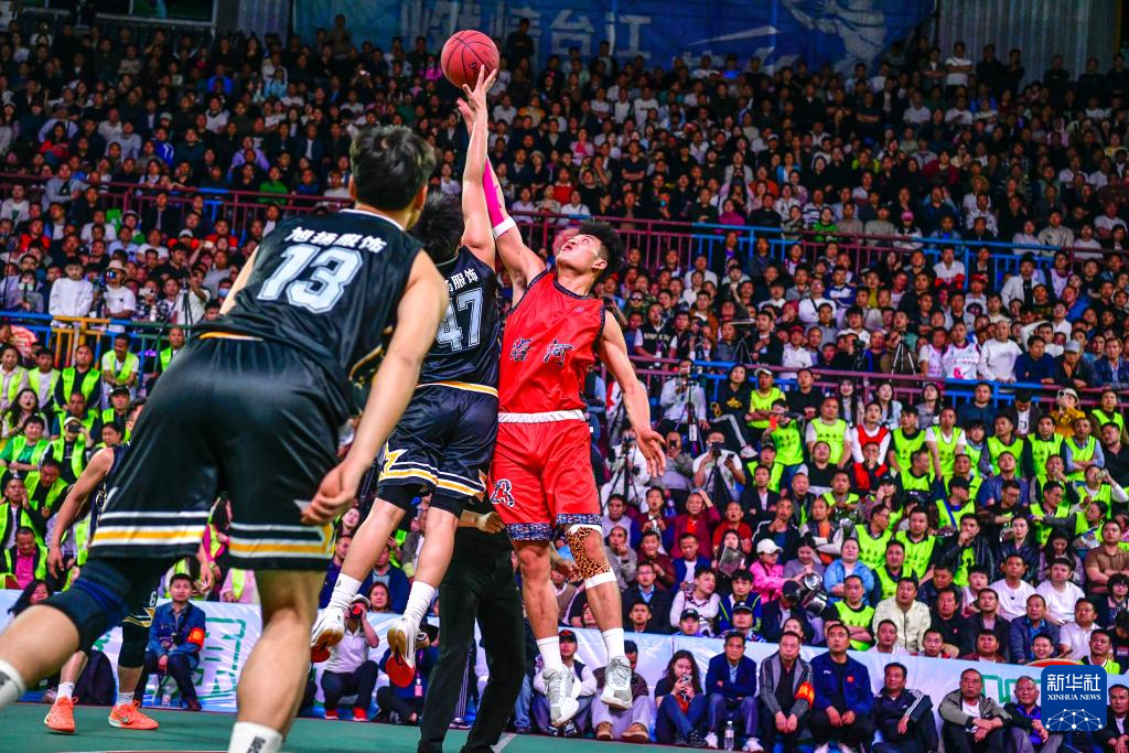 4月11日,沿河队球员田义(右)与凯里队球员吴家彬在比赛中跳球。新华社记者杨文斌 摄