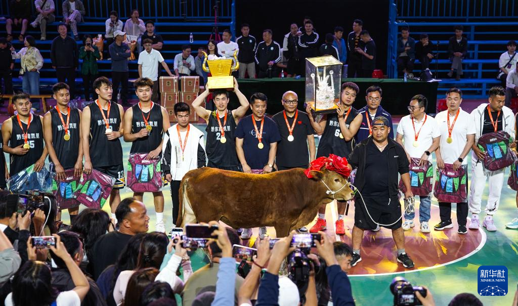 4月11日,获得冠军的凯里市代表队在颁奖仪式上,他们获得的奖品是当地黄牛。新华社记者杨文斌 摄