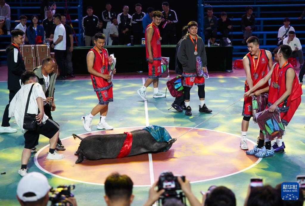 4月11日,获得亚军的沿河县代表队在颁奖仪式上,他们获得的奖品是当地黑毛猪。新华社记者杨文斌 摄