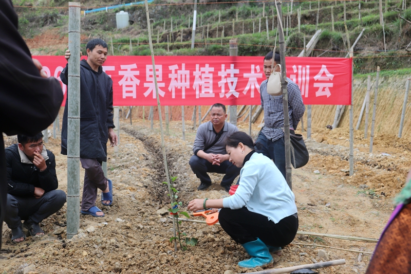为了让技术更接地气、更易被乡亲们接受,陆伟英特意用侗语双语讲解,把专业术语转化为通俗易懂的大白话,还经常组织现场实操培训,带着农户一起干、对着学。从“小杯换大杯”育苗技术推广,帮助果苗规避倒春寒、提升成活率;到指导改良搭架方式、安装水肥一体化设施,让一人能管几十亩地;再到手把手教病虫害识别与防治,守护果园健康生长——她把每一项技术都揉进日常服务里,让科技真正扎根土地、惠及农户。