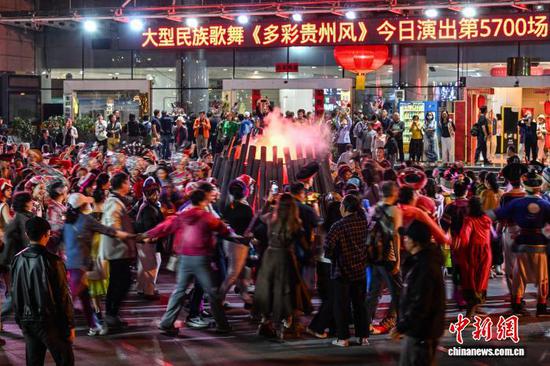 4月16日晚,游客和《多彩贵州风》演员在贵阳大剧院广场围着“篝火”尽情欢跳。中新社记者瞿宏伦 摄