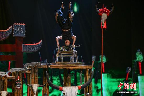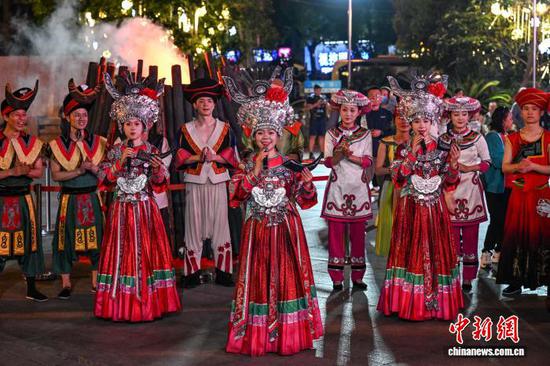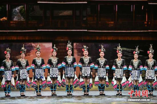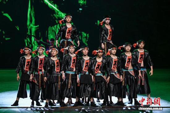 4月16日晚,苗族群舞《岜沙汉子》。中新社记者瞿宏伦 摄