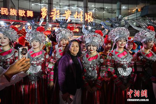 4月16日晚,游客和《多彩贵州风》演员合影。中新社记者瞿宏伦 摄