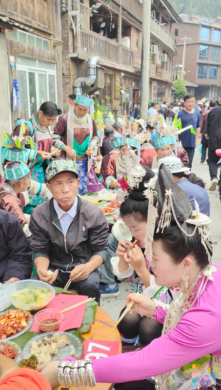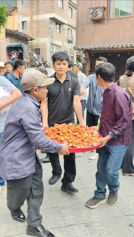 活动当天,清晨7点的上寨广场便热闹起来。妇女们忙着蒸煮糯米饭、洗菜切菜,男人们则负责切肉、炒肉、摆放桌子板凳,男女老少齐上阵,干群一心,共同参与长桌宴的准备工作。中午12点,长桌宴正式开席,猪肉、腌肉、腌鱼、牛肉等各色菜肴被端上餐桌,浓郁的“人间烟火味”随之在舌尖蔓延,引得食客赞不绝口。一位来自广东的游客笑着说道:“长桌宴饭菜很好吃,糯米饭特别香!”