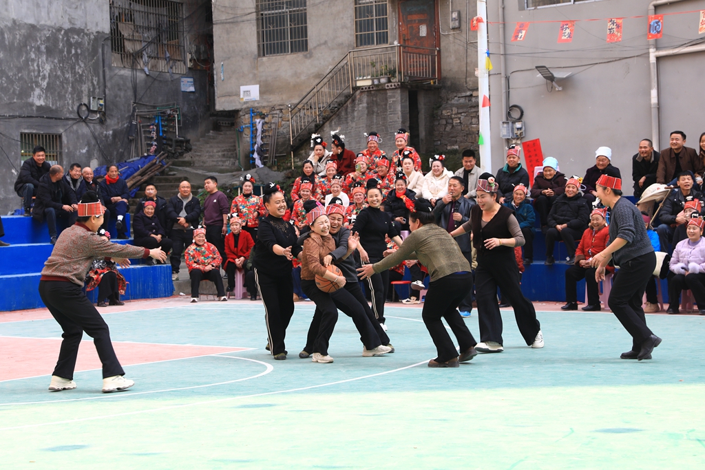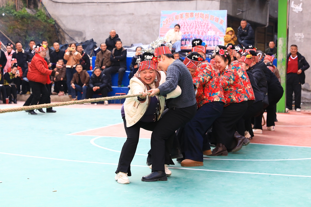 歌舞尽兴后,趣味竞技环节更添团圆喜乐。姑妈队对阵舅妈队、姑爹队对阵舅爹队,篮球场上,大家传球、奔跑、投篮,配合默契、欢乐不断;拔河比赛将气氛推向高潮,各队紧握长绳奋力后拉,通红的脸颊上写满倔强与团结,绳结的每一次移动都牵动着全场目光,现场加油声、欢呼声此起彼伏;男女混合接力赛独具特色,不光比速度、比力量,更把亲情藏在每一棒的交接里,越比越亲、越比越暖。