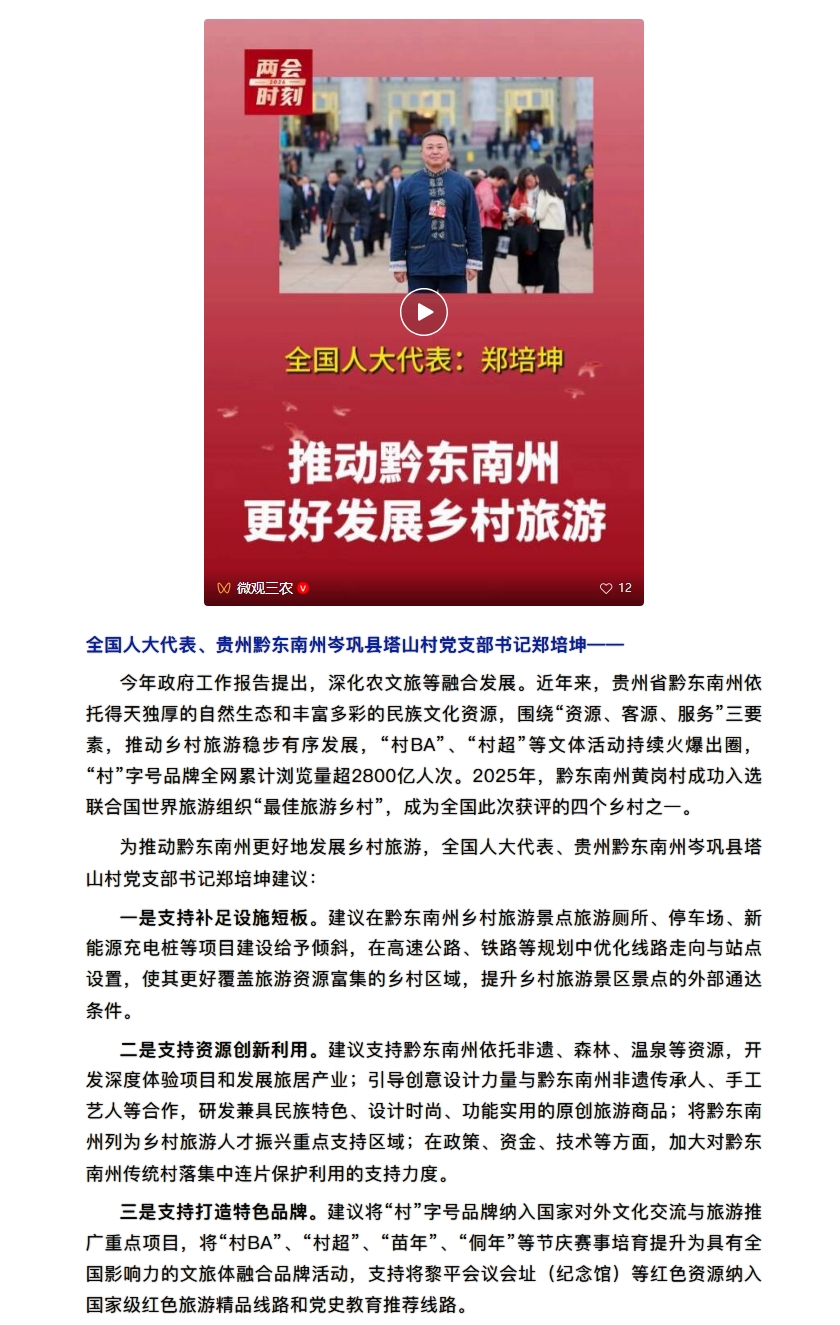 郑培坤代表:进一步支持贵州黔东南州发展乡村旅游