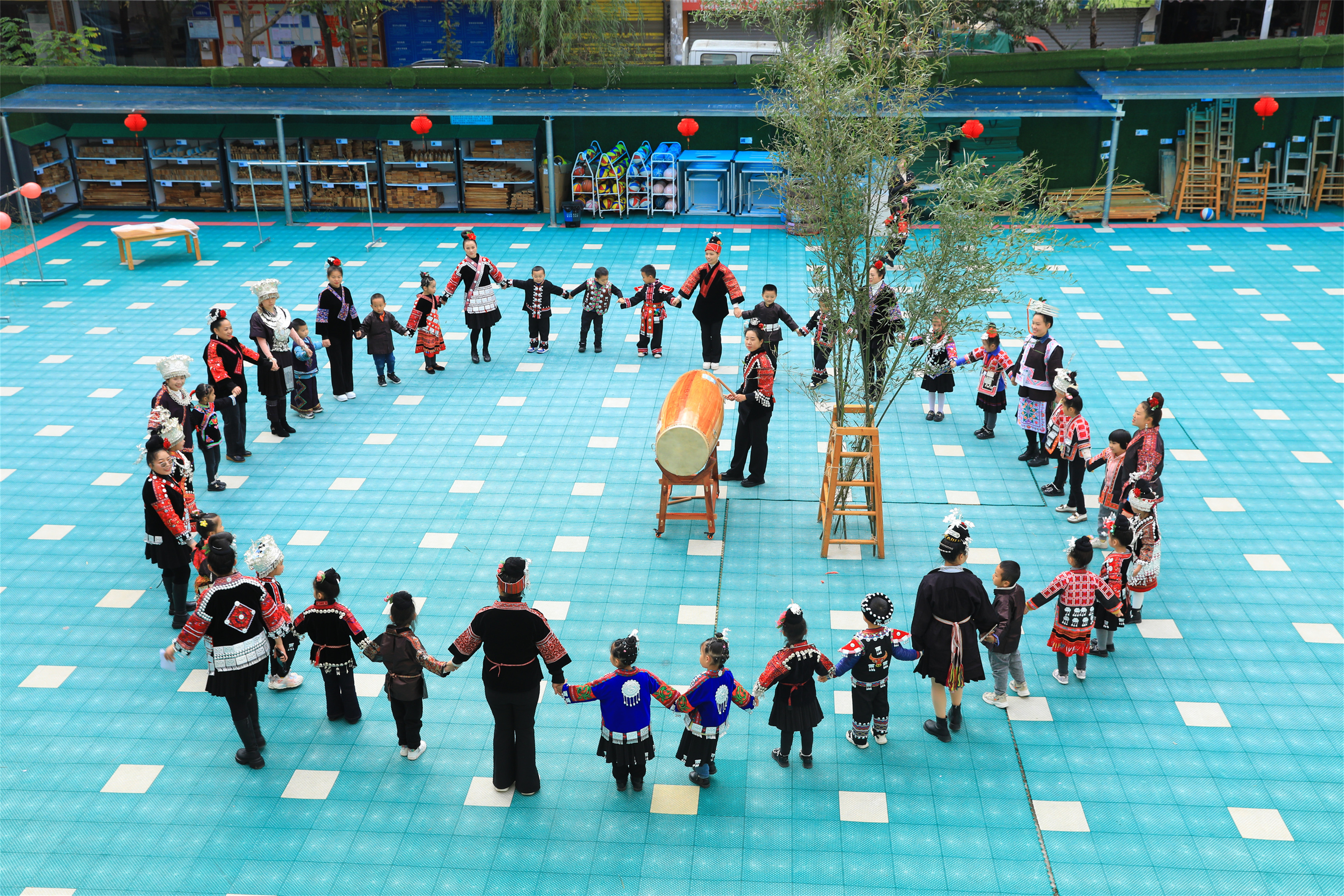 剑河县示范幼儿园的师生在跳苗族水鼓舞