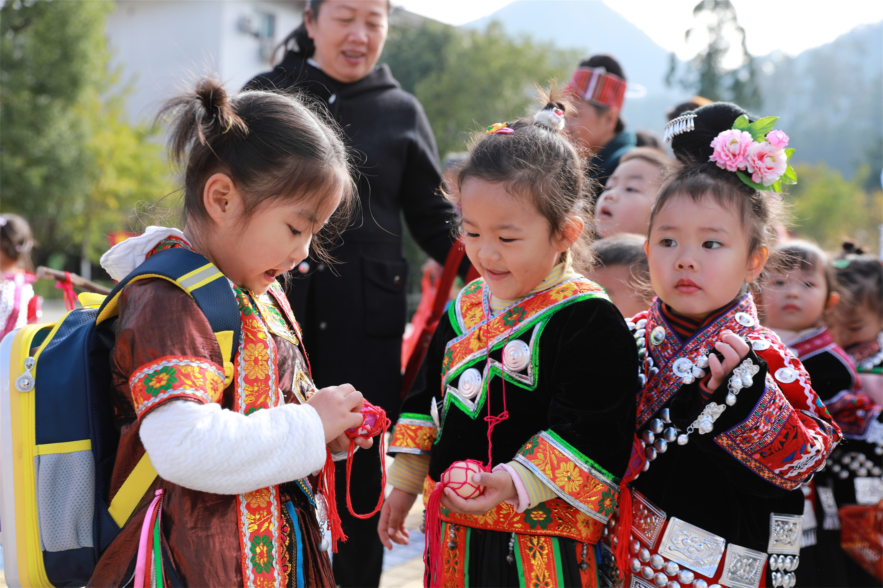 剑河县中心幼儿园的孩子们身着苗族盛装参加苗年活动