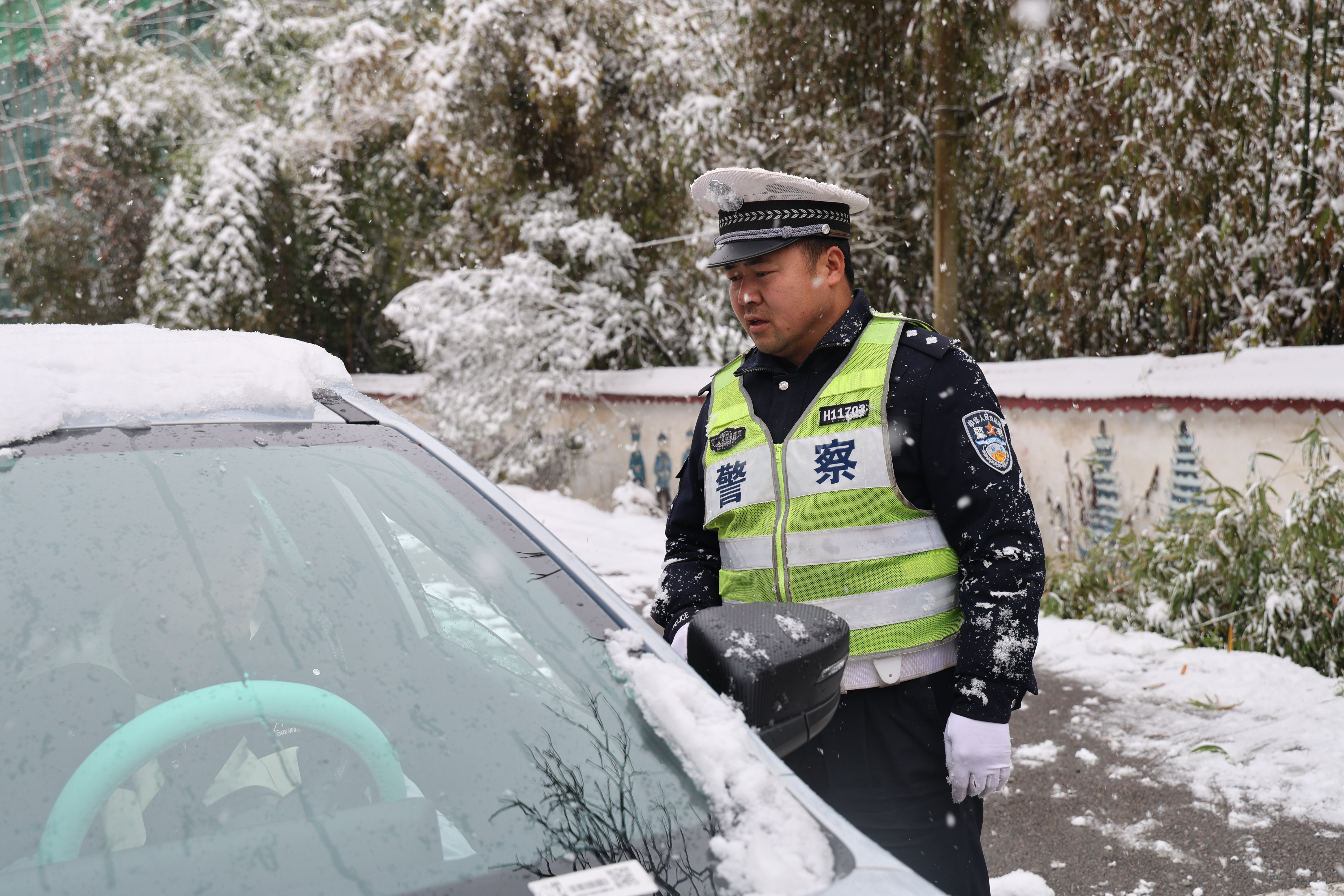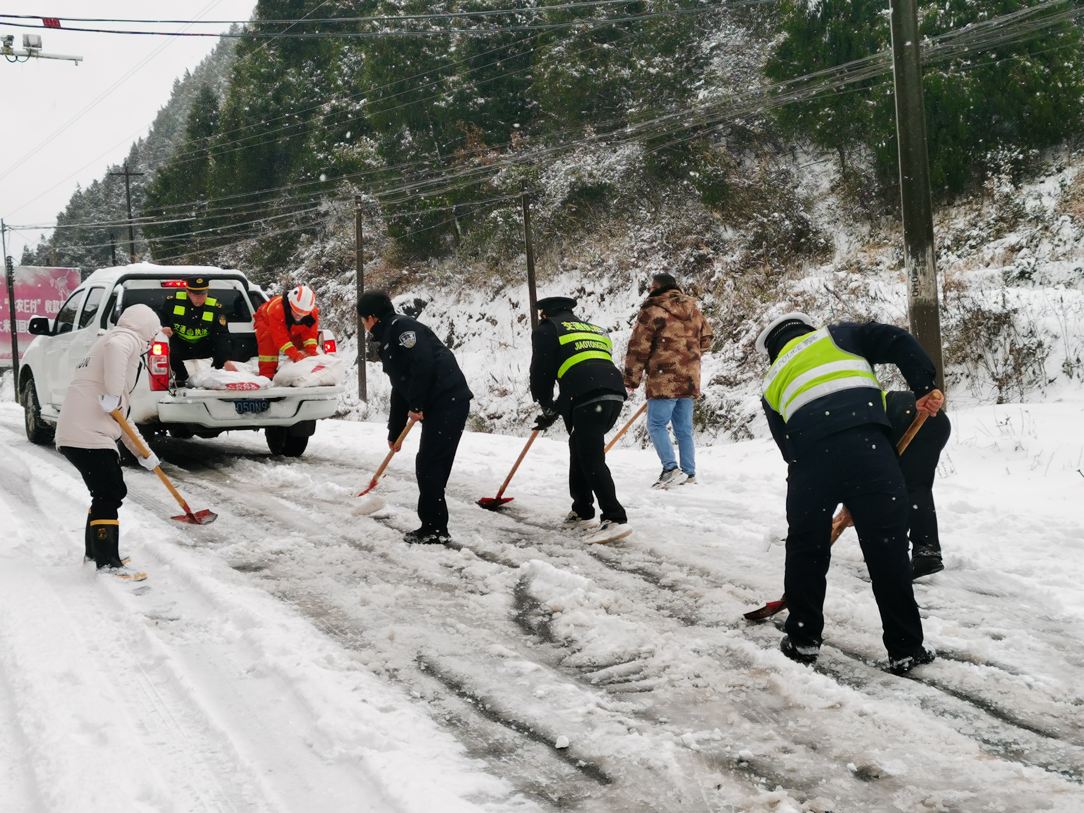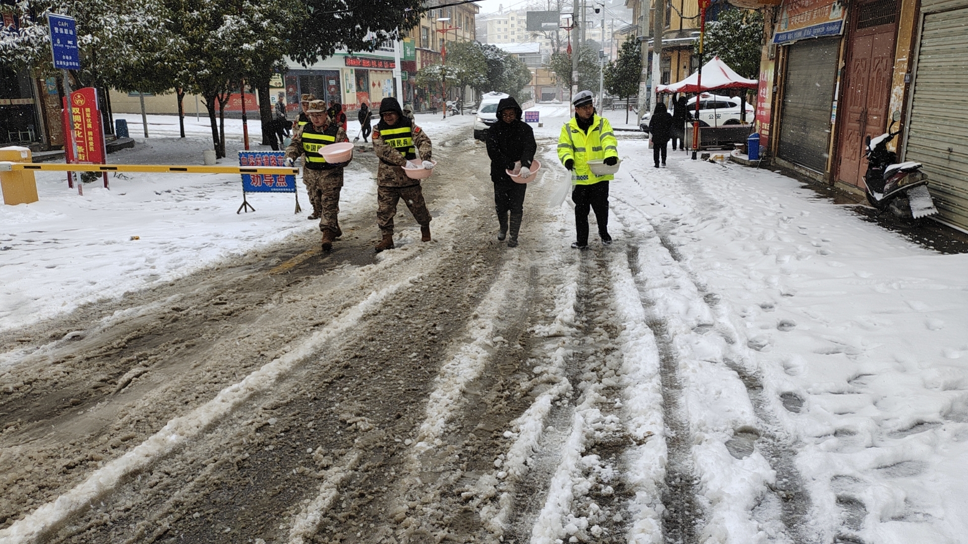 1月21日晚开始,施秉县迎来今年首场强降雪天气,气最低降至-8℃,大雪纷飞,给群众出行带来诸多不便。为切实保障群众雪凝恶劣天气下出行安全,施秉县公安局各派出所、交警大队等部门合理部署警力,对辖区凝冻路段进行巡逻值守、设置警示标志、劝返和帮助受困车辆等措施。在重要路段、时段与“一路多方”协同配合撒盐融冰,及时消除道路交通安全隐患,有效预防道路交通事故的发生。