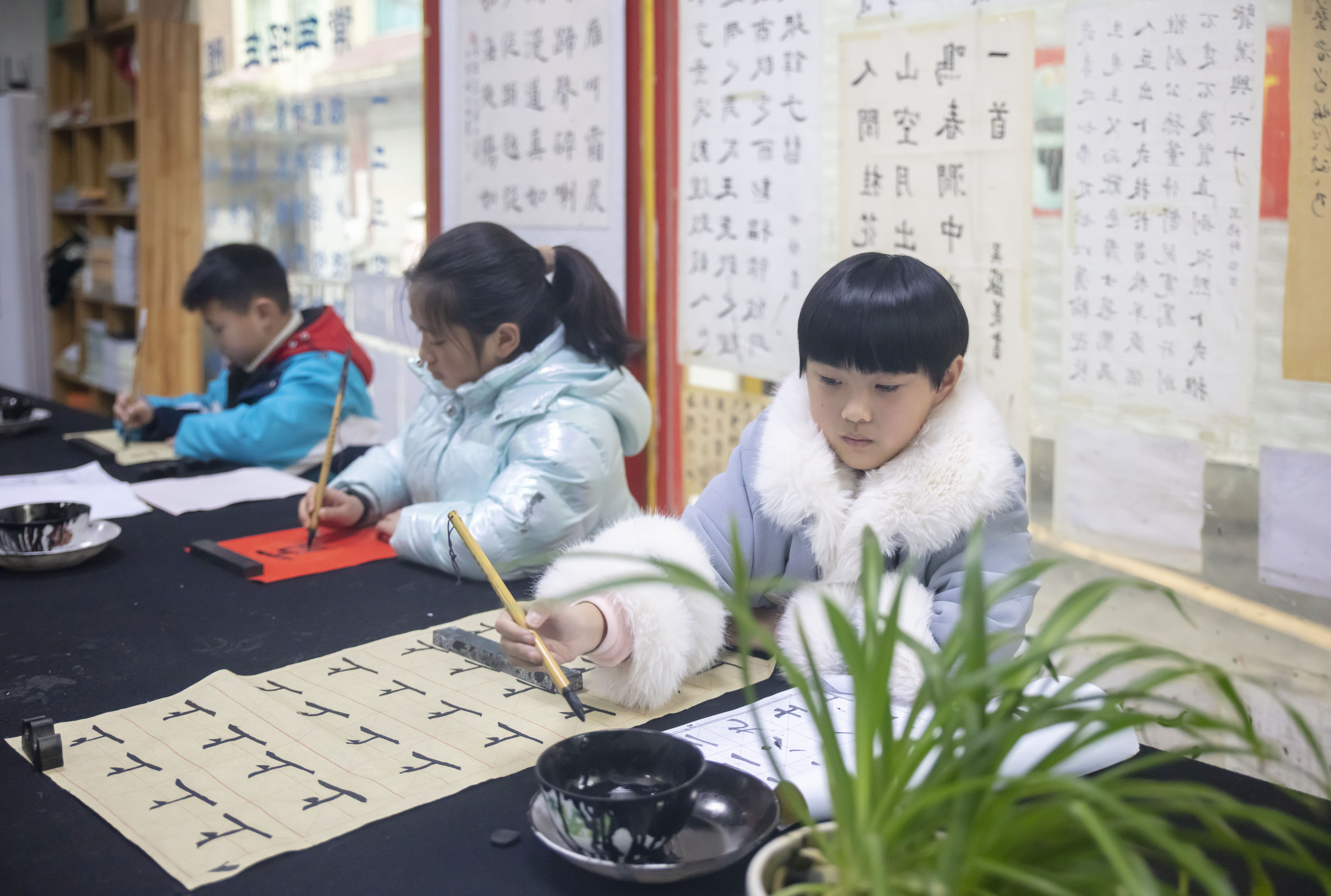 1月30日,学生在施秉县一家书法培训中心学习书法