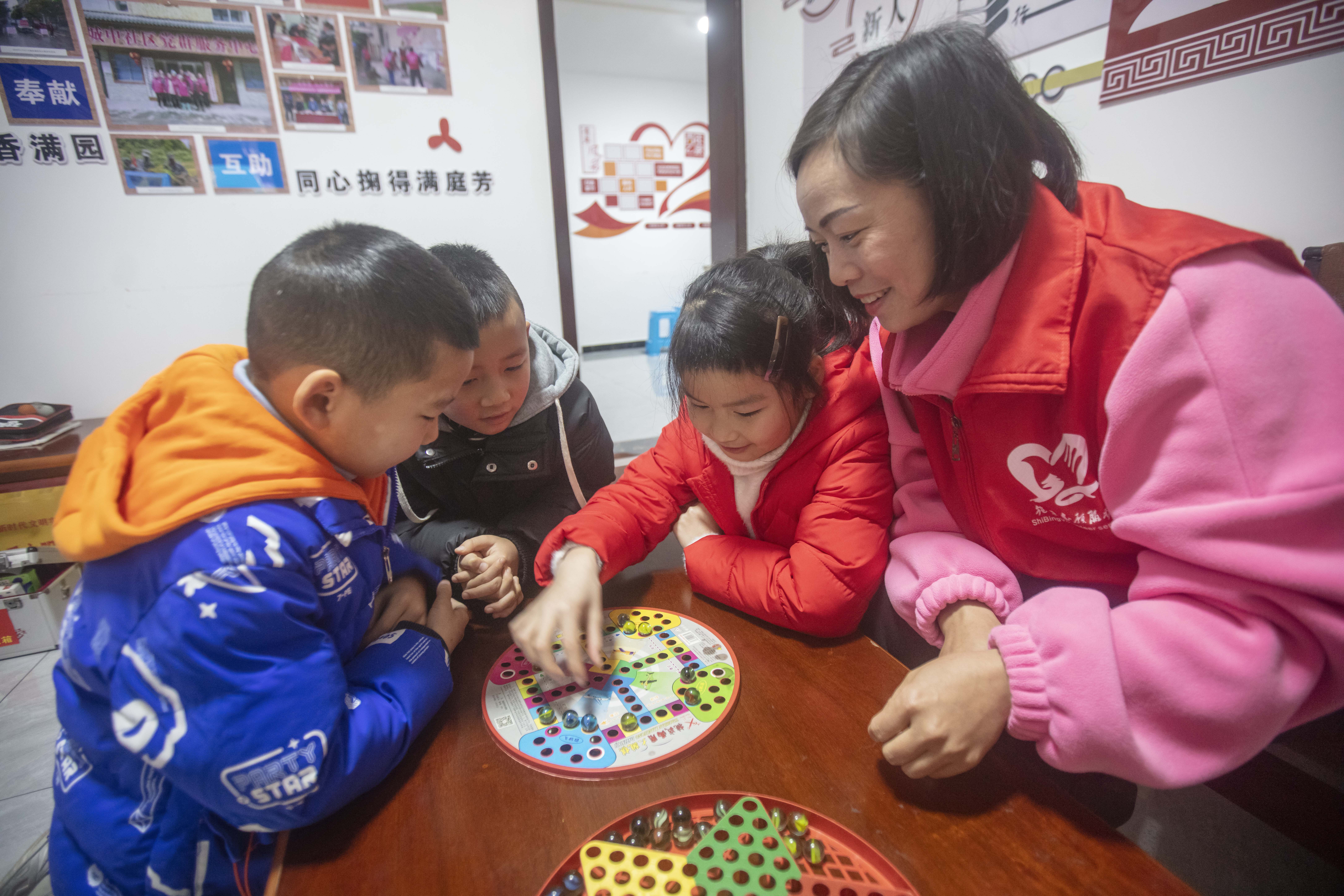 1月30日,寒假公益托管班的志愿者在施秉县城中社区陪小学生下跳棋