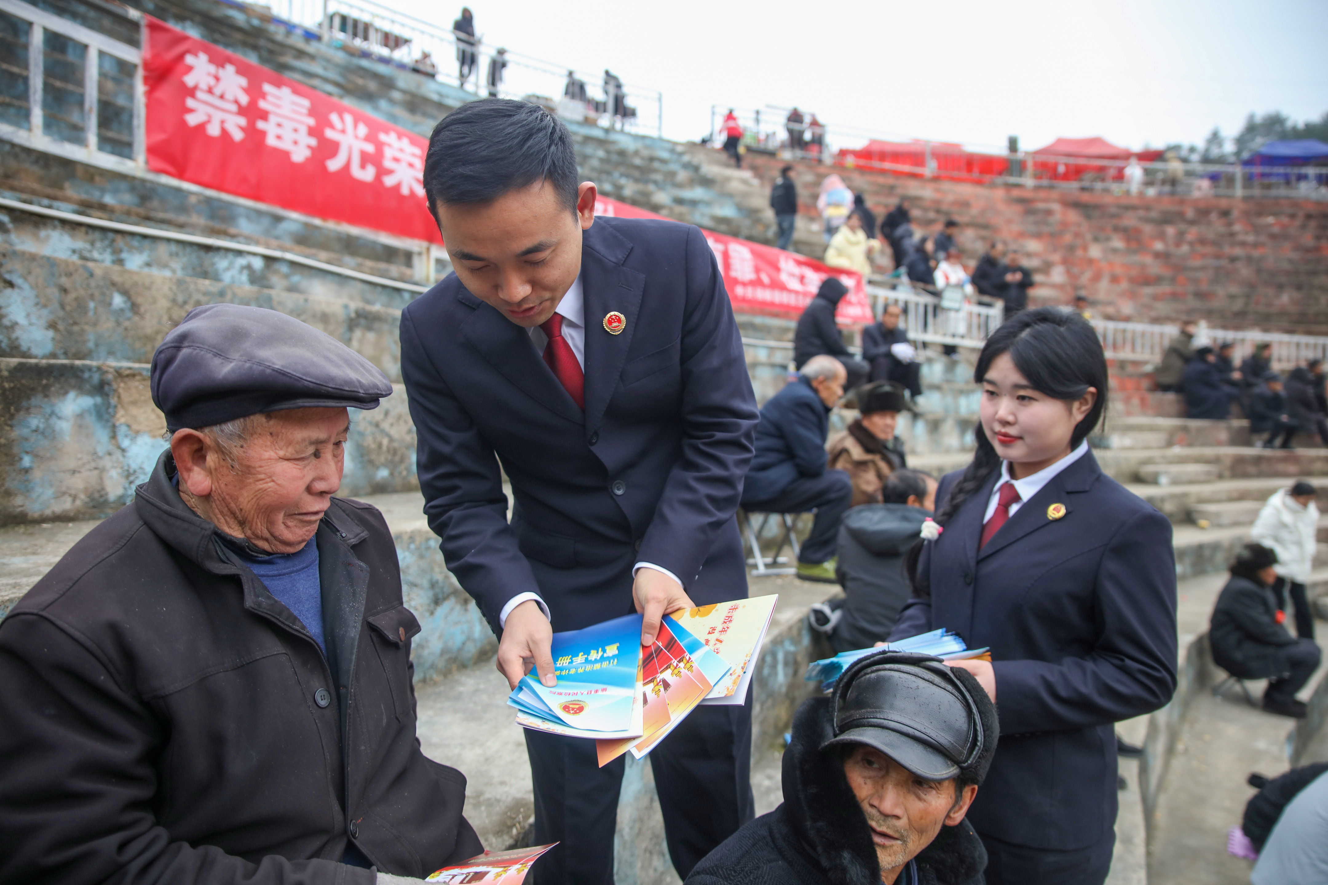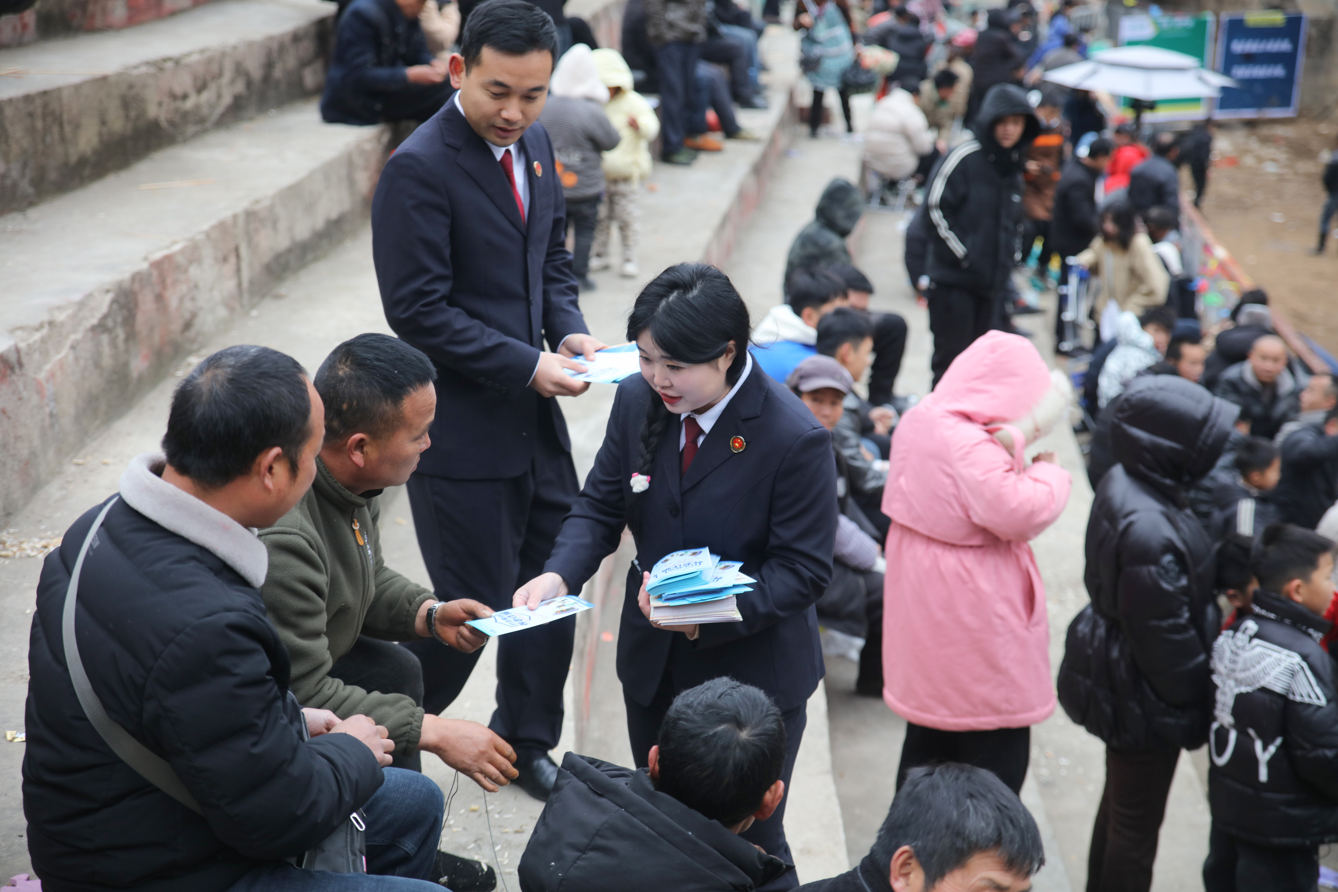 2月2日,施秉县检察院干警在当地一斗牛活动现场向群众发放普法宣传资料