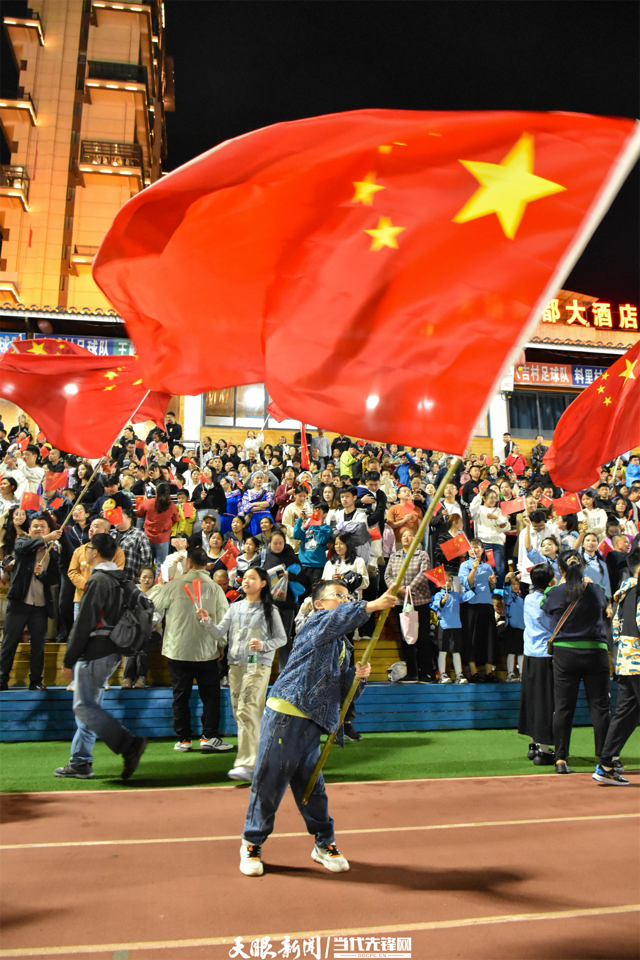 国庆节期间,榕江县推出“村超”+村寨、“村超”+啦啦队、“时代金曲·全民K歌”“舞动村超·嗨翻全场”等新玩法,丰富游客体验。10月1日晚,在“村超”现场,随着第一届贵州村超“一带一路”国际友谊赛暨贵州-粤港澳大湾区“村超”足球友谊赛的进行,一个个精彩的节目相继上演,现场气氛热烈火爆,观众挥动国旗,庆祝中华人民共和国成立75周年。