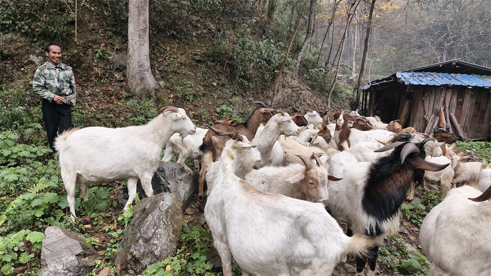 “我养羊也有20年了,我认为要干得好,第一是要坚持,只有坚持才能干得成,第二是要掌握一些技术,特别是山羊的病多,要会治。”杨政章说。杨政章的山羊完全是原生态的养殖,羊群放归大山,让它们与山为伴,用大山的力量生长繁殖,这样极大地降低了养殖成本,但却需要更多的看护。