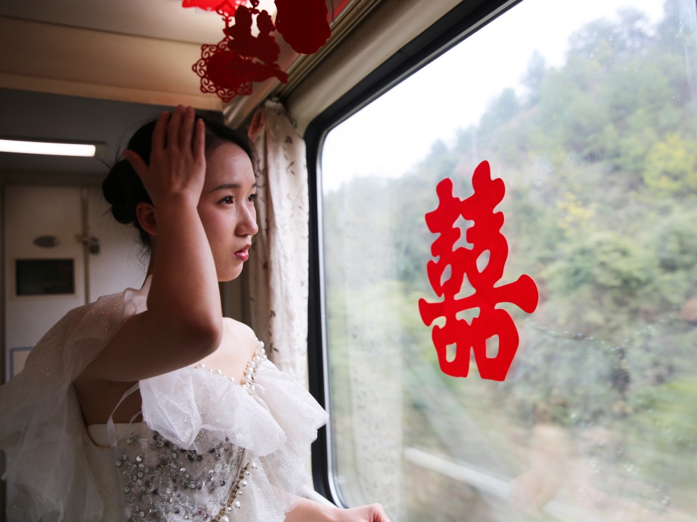 1月2日上午,记者走进5640/39次列车婚礼车厢时,工作人员正忙碌着装饰婚礼车厢:彩带飘扬、鲜花簇拥,大红喜字挂满整个车厢,温馨而喜庆,充满浪漫气息。