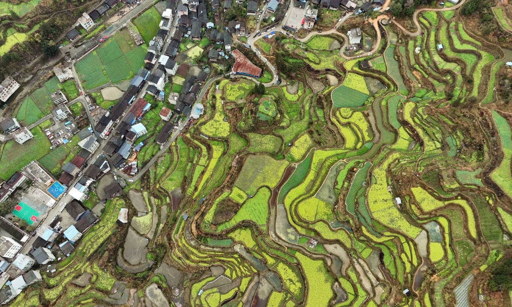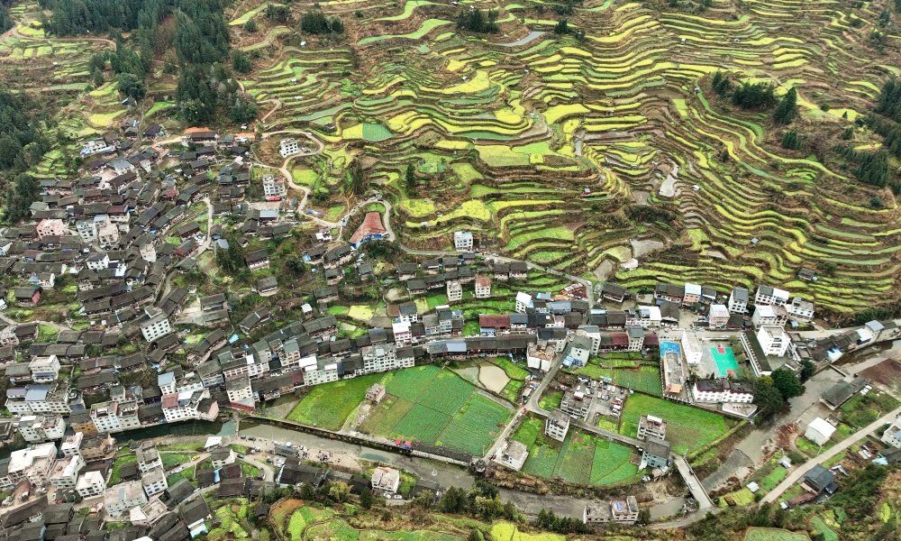 近日,在贵州省黔东南苗族侗族自治州榕江县乐里镇大瑞村瑞里侗寨边的梯田,油菜花竞相开放,金黄色的油菜花与村寨、公路、河流、山野交相辉映,呈现出一道亮丽的风景。