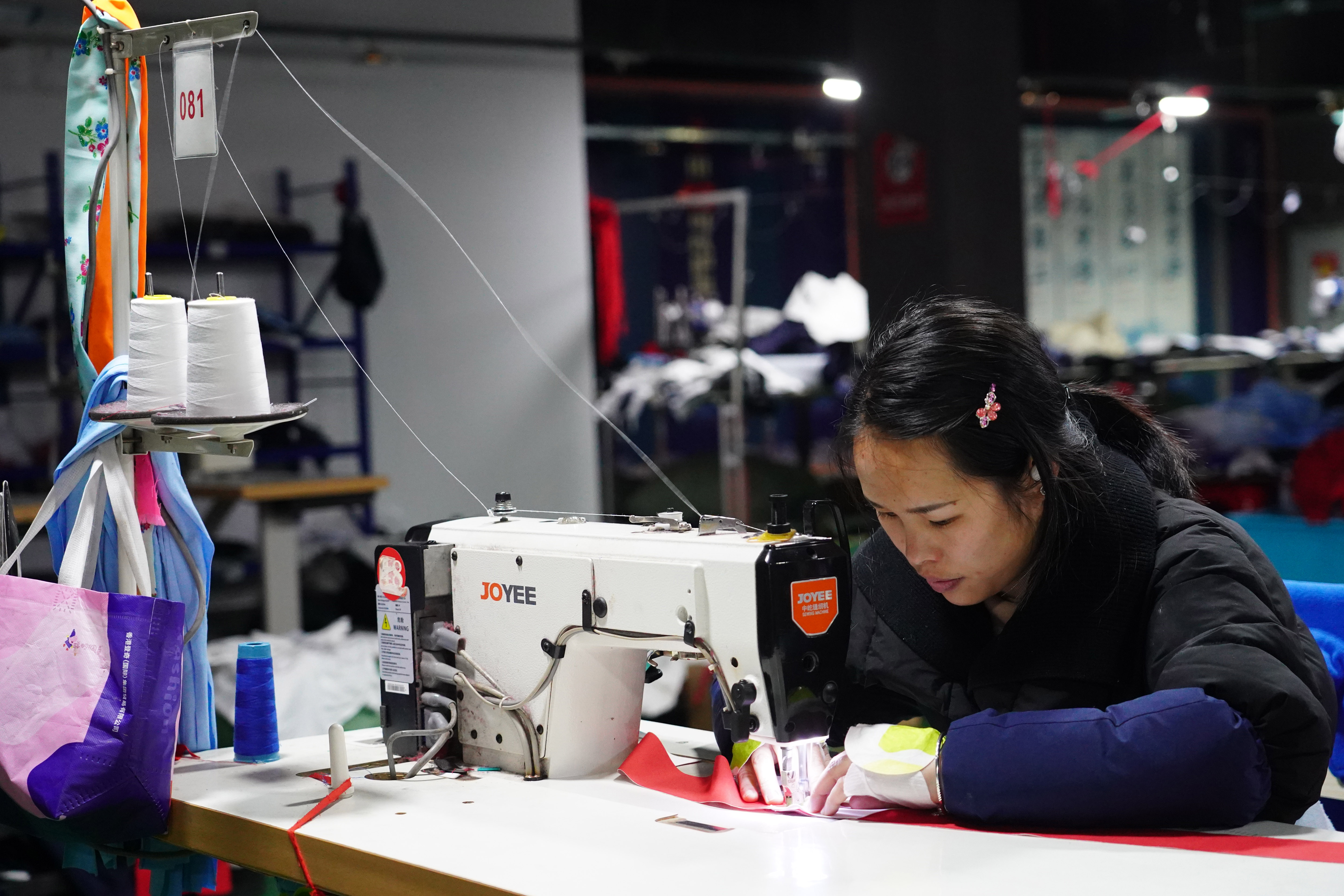 3月6日,工人在贵州省黔东南苗族侗族自治州从江县美娥社区一家制衣企业的车间赶制订单。