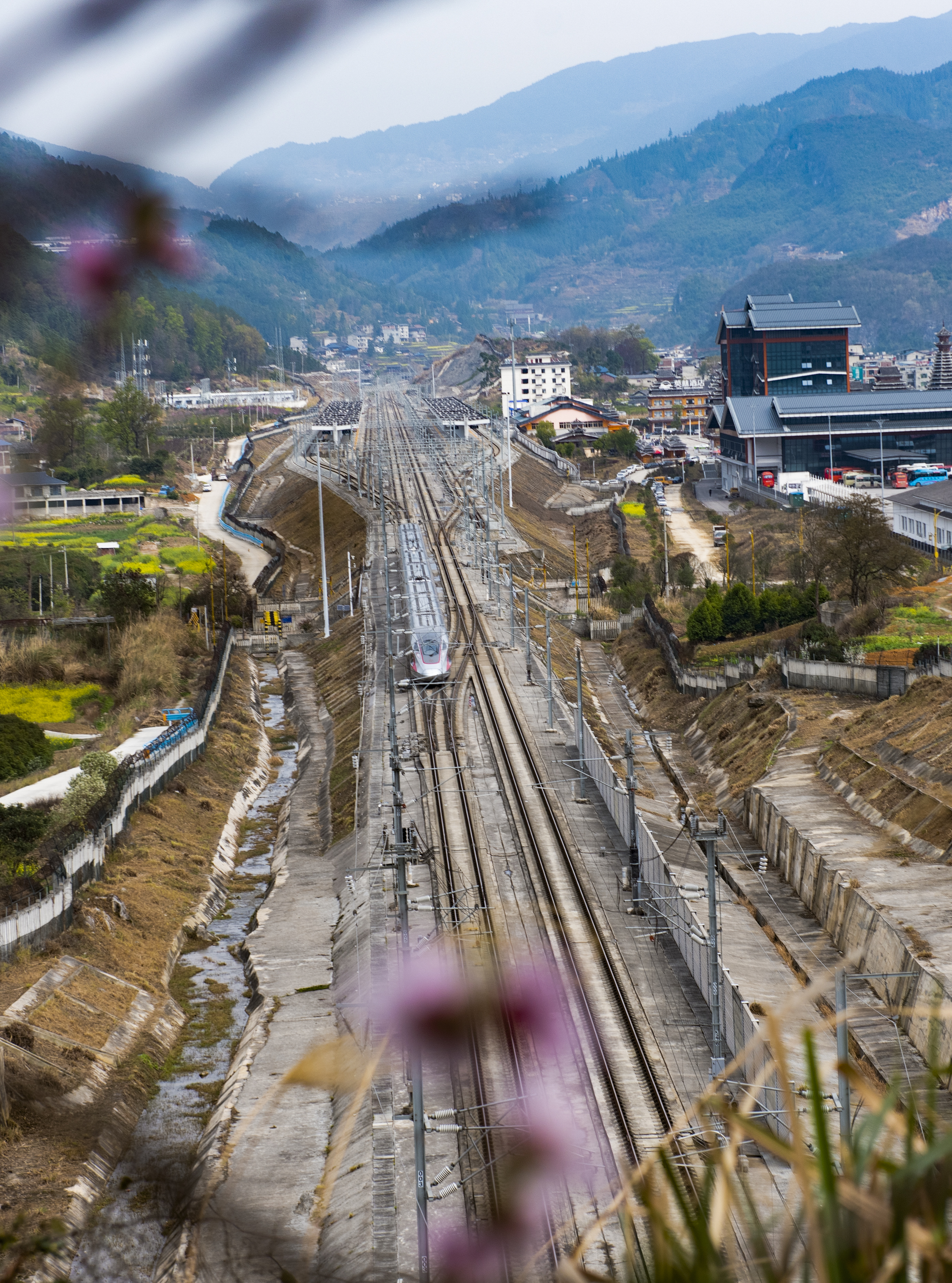 3月16日,仲春时节,贵州省黔东南苗族侗族自治州从江县境内的油菜花和桃花竞相绽放,动车组列车穿行其间,与油菜花和桃花相映成景,构成一幅春日美丽画卷。