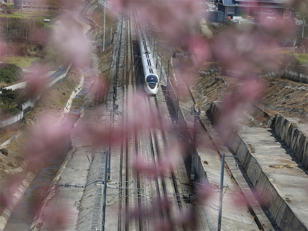 3月20日,当日是二十四节气中的春分,贵州省黔东南苗族侗族自治州从江县境内的油菜花、桃花、李花、梨花竞相绽放,动车组列车穿行其间,构成一幅春日美丽画卷。