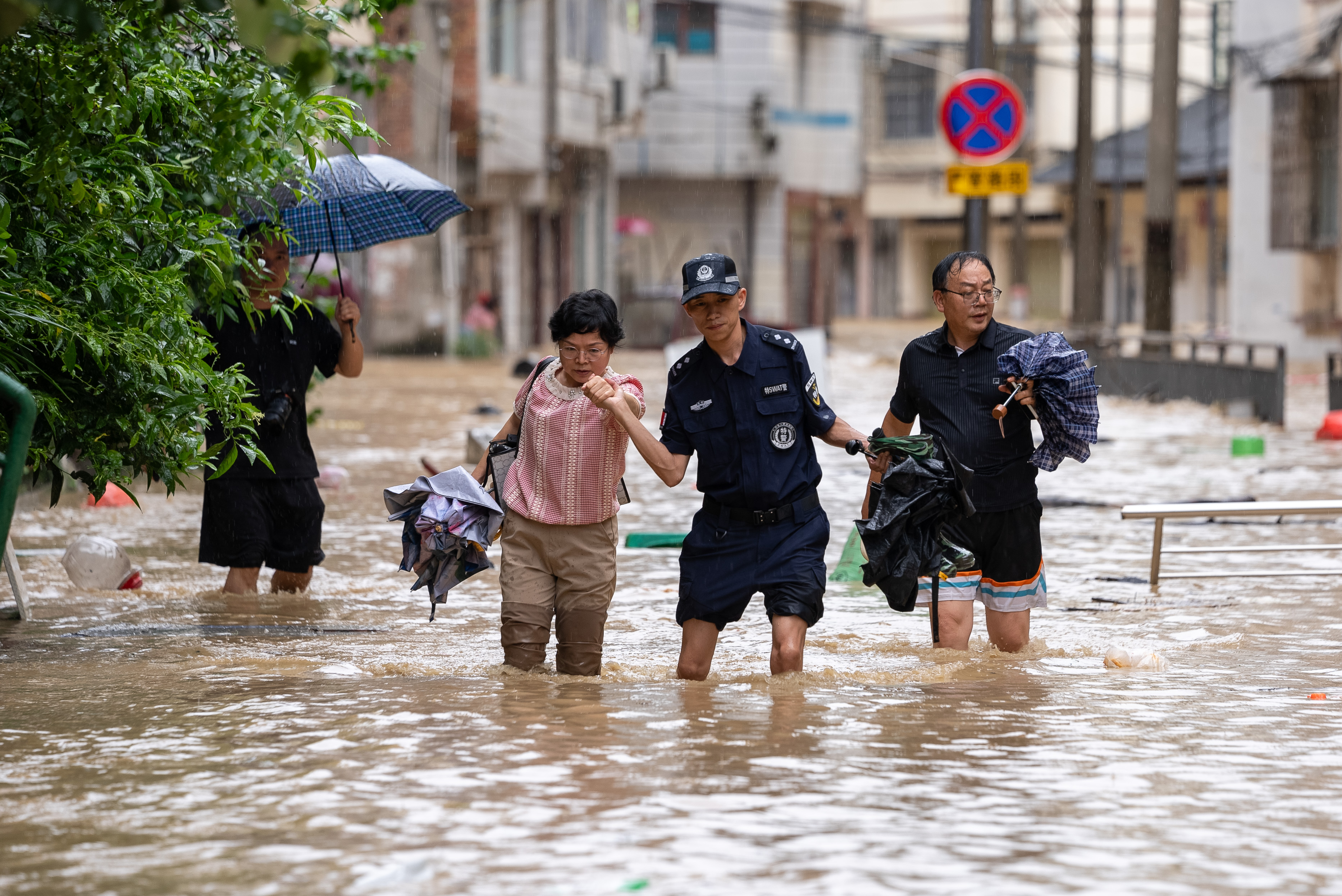 上午10时40分,洪峰流量突破9900立方米/秒,水位暴涨至超危险线1.9米。新建路的航运码头至江西农贸市场路面洪水涨至30厘米,且持续攀升。面对危急形势,公安民辅警、消防救援人员与党员干部通过橡皮艇转运二楼被困群众及物资,对行动不便的老人采用担架转移。