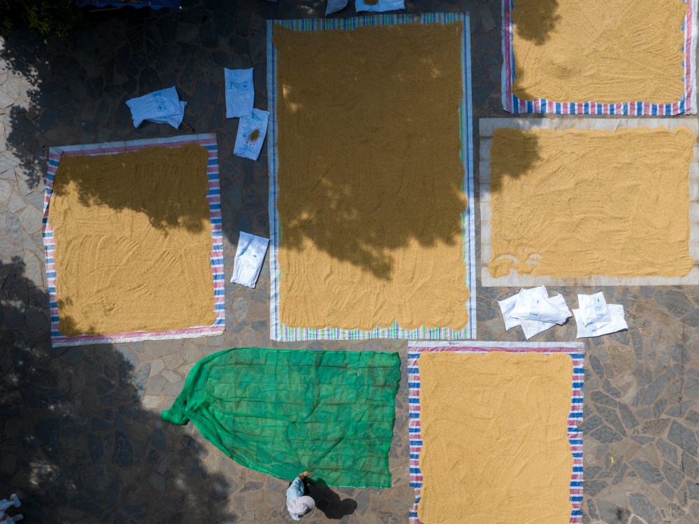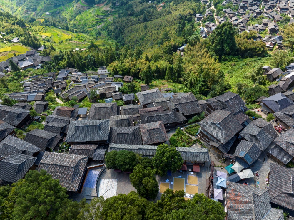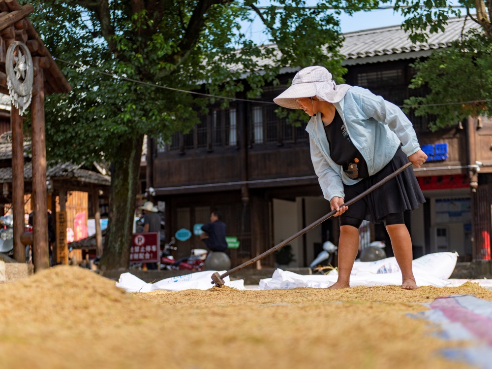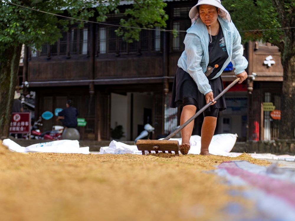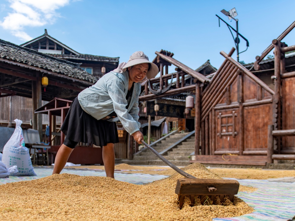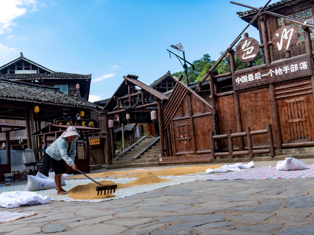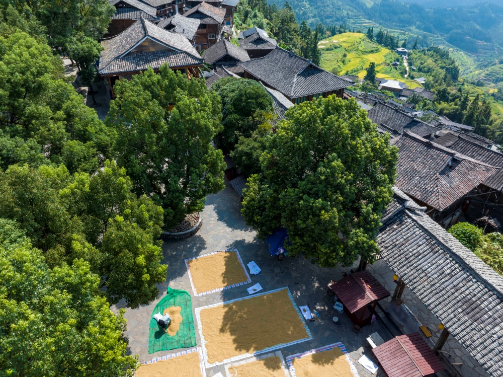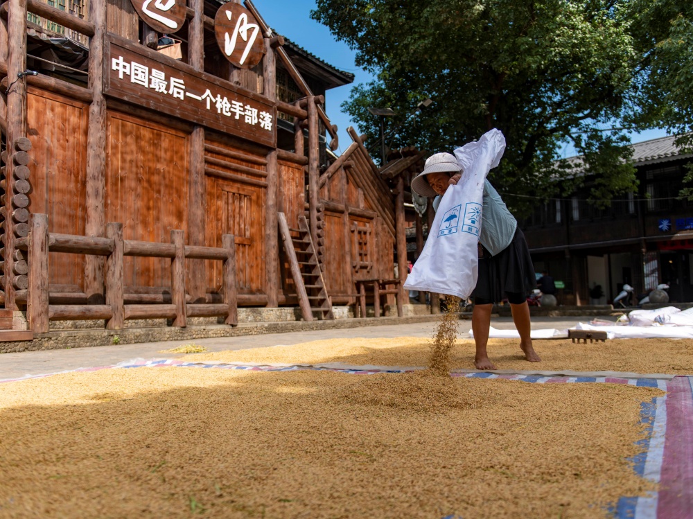 9月3日,在贵州省从江县丙妹镇岜沙苗寨,村民在晾晒稻谷。