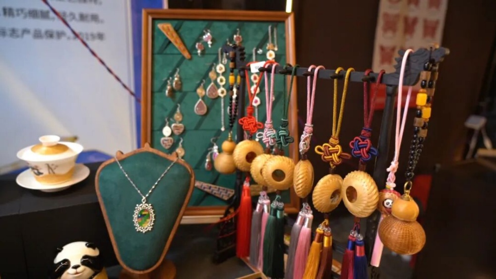 与此同时,道明竹编区域更是围满了游客。该区域的传承人虽是一位听障人士,却以一双巧手和专注的神情,将纤细的竹条精准地编织在茶具、杯器之上,巧妙地融合了传统竹编工艺与当代生活美学。不仅令围观游客赞叹不已,还吸引了其他非遗技艺与其合作。