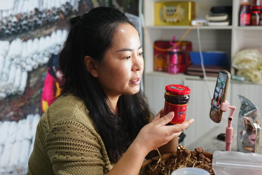 “家人们,这是我们最火的林下茶树菇辣椒酱!开瓶就是满屋菌香,拌面拌粉都不用再加调料!”公司总经理丁德芬手中轻托一瓶红亮油润的辣椒酱,面对镜头热情洋溢地介绍产品。