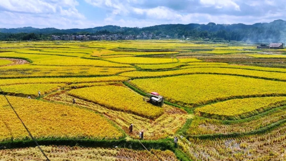 金秋时节,走进天柱县凤城大坝、高酿大坝等水稻主产区,层层梯田错落铺展,稻穗饱满压弯了禾秆。微风掠过,稻香阵阵。田间地头,收割机往来穿梭,割稻、脱粒、粉碎秸秆等工序一气呵成。金黄的稻谷顺着输送管倾泻而入,装进路边的运粮车,农户脸上写满了丰收的喜悦。