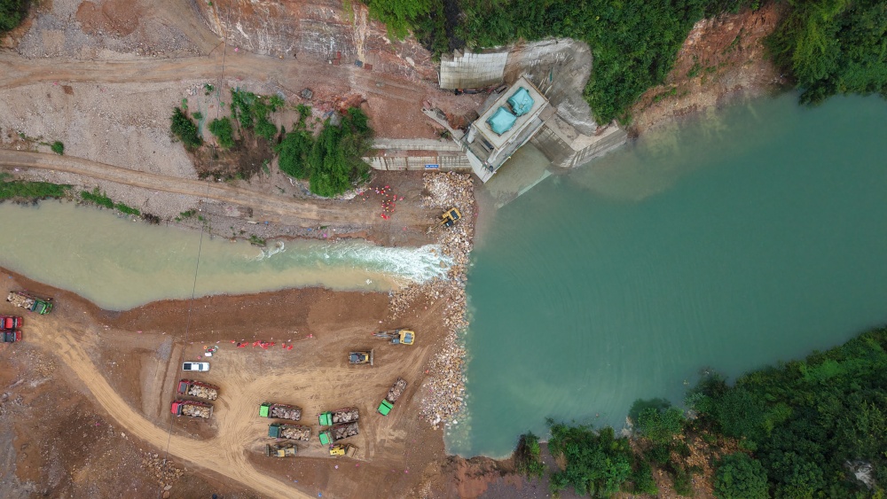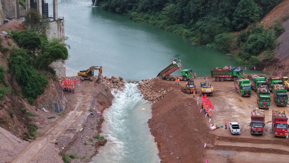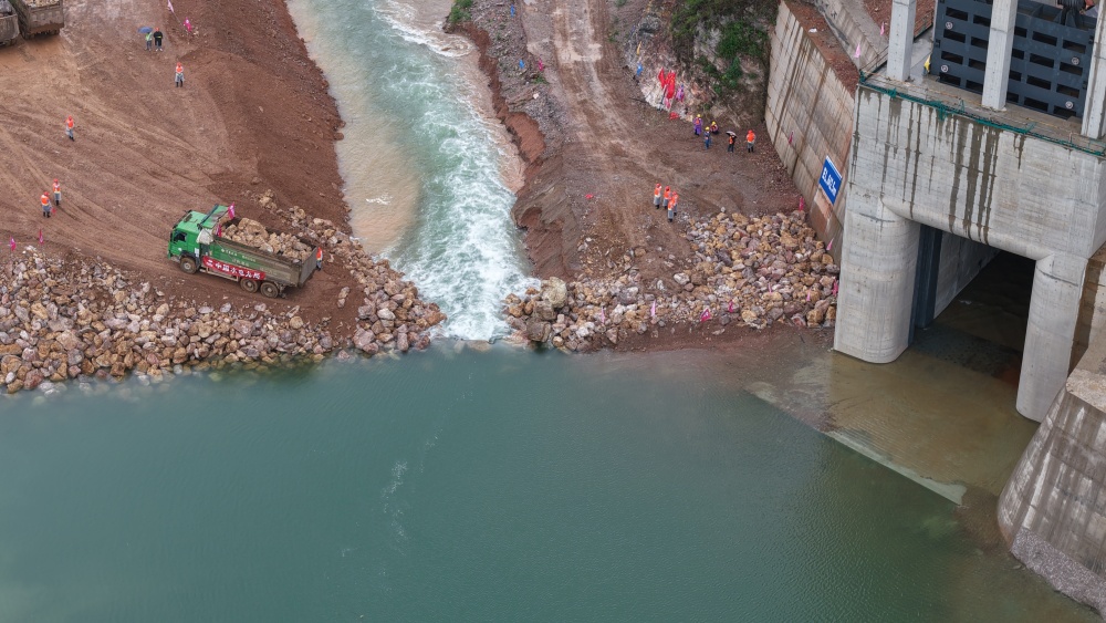 当天上午,在宣威水库大坝进行截流,自卸车将土石方等抛投材料倾泻到清水江中,很快清水江被截断河水经右岸导流洞下泄。