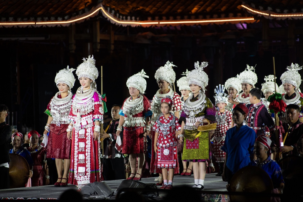 整场演出的高潮——大型原生态民族服饰秀,以服饰为媒介,演绎了一部“穿在身上的生命史诗”。模特们依次展示不同年龄阶段的特色服饰:孩童服饰以花鸟挑花纹样启蒙自然认知;青年女性谷陇式盛装最为华美,衣背绣纹精细繁复,百褶花裙缀满彩条,配以振翅欲飞的银质凤冠;婚嫁服饰更是承载历史记忆,用12米布料制成的百褶裙记录迁徙历程,重达十公斤的银饰与七圈项圈闪耀家族荣光;老年服饰则回归简朴深沉,头帕包裹岁月智慧,旧嫁衣沉淀时光印记。