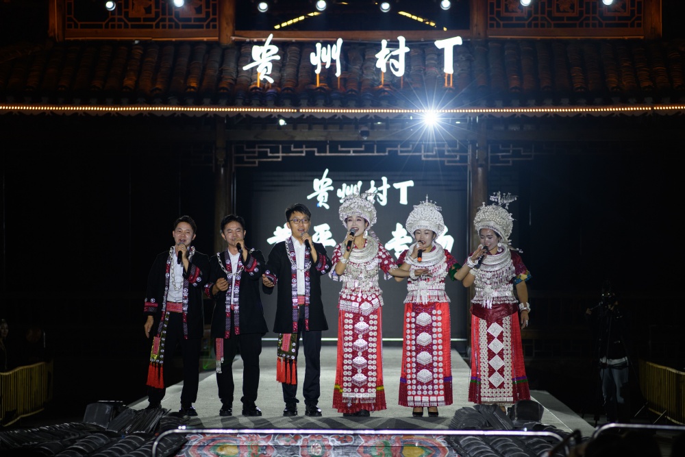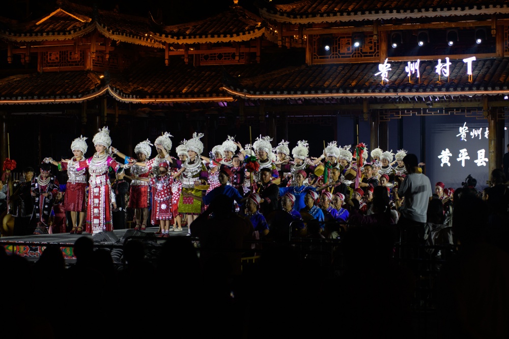演出在黄平苗歌传承协会的《苗族大歌》中启幕,多声部合唱如天籁般萦绕会场,古朴悠远的旋律瞬间将观众带入苗乡秘境。黄平县文化馆演绎的《板凳舞跳起来》随即点燃全场热情,表演者手持板凳踏节而舞,清脆的敲击声与欢快舞步交织,展现苗族同胞豪迈奔放的性格特质。丹阿组合献唱的《带你去贵州》用旋律勾勒黔中山水,蓝天团队《我在黄平等你来》则以质朴歌声向四方宾朋发出真挚邀约。