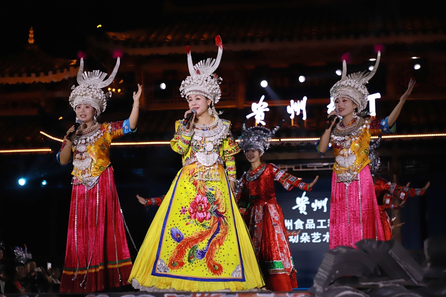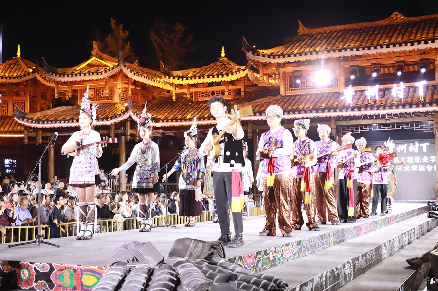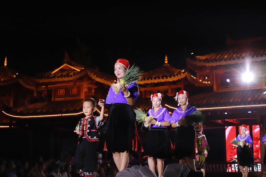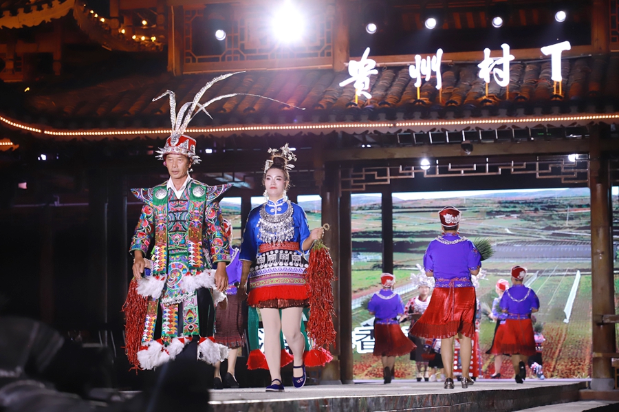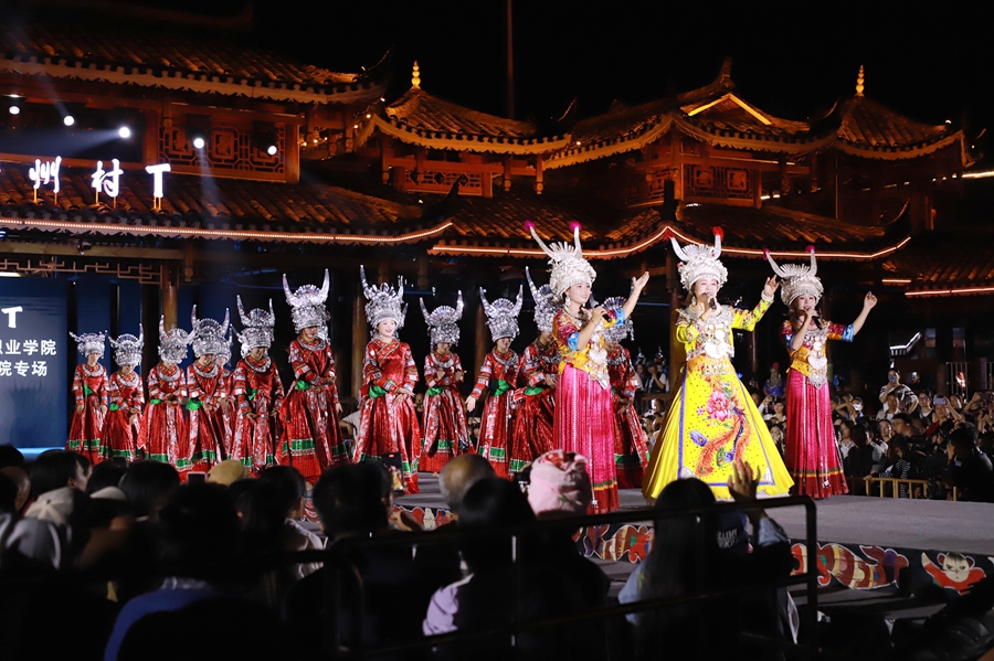 其他演出板块也紧密呼应农创主题。贵州食品工程职业学院阿幼朵艺术学院的民族服饰走秀中,模特腰间悬挂绣有稻穗的香囊;城西街道艺术团的舞蹈《一曲欢歌唱起来》,巧妙融入农耕元素。当最后的民族大团结T台秀落幕,农户与“模特”们并肩而立,共同展示手中饱含希望的农特产品时,让人激动不已。