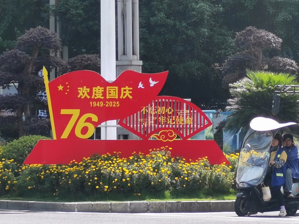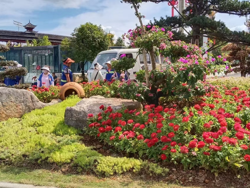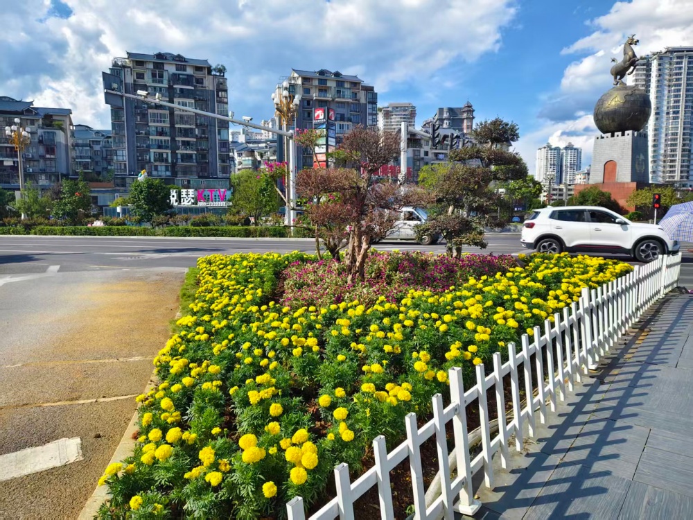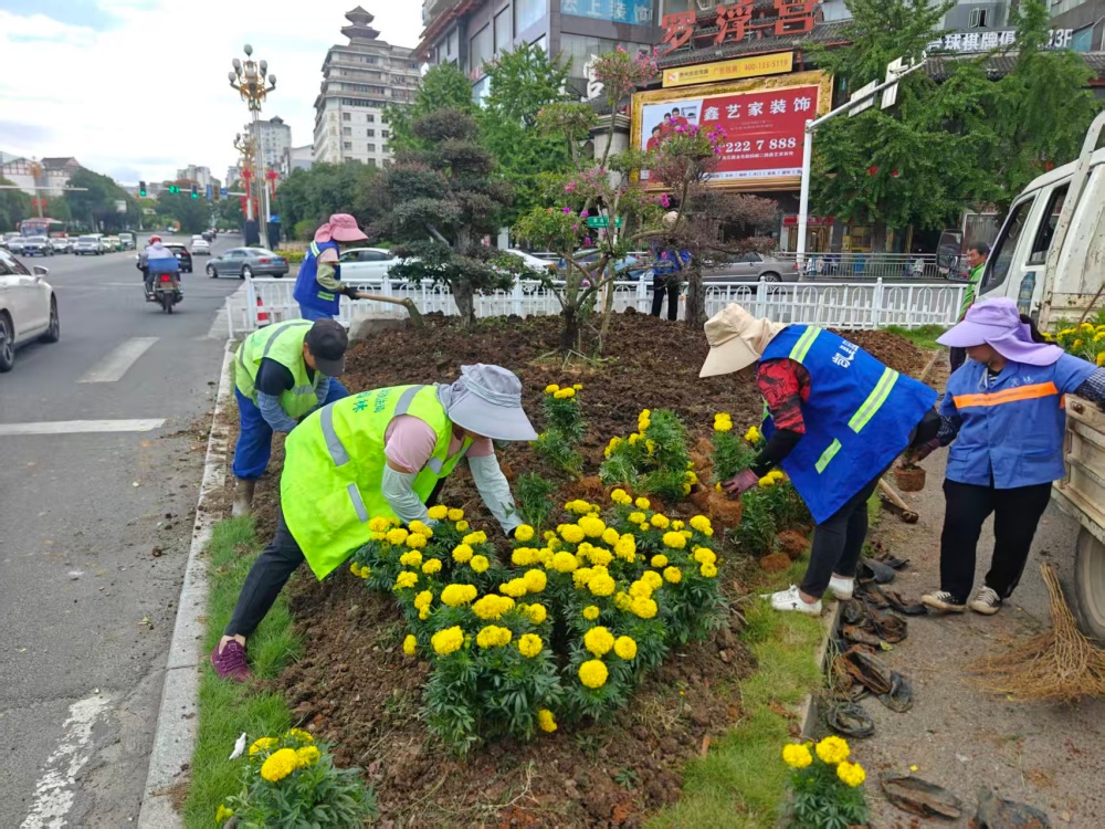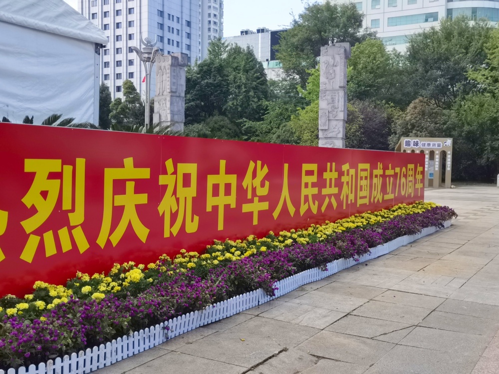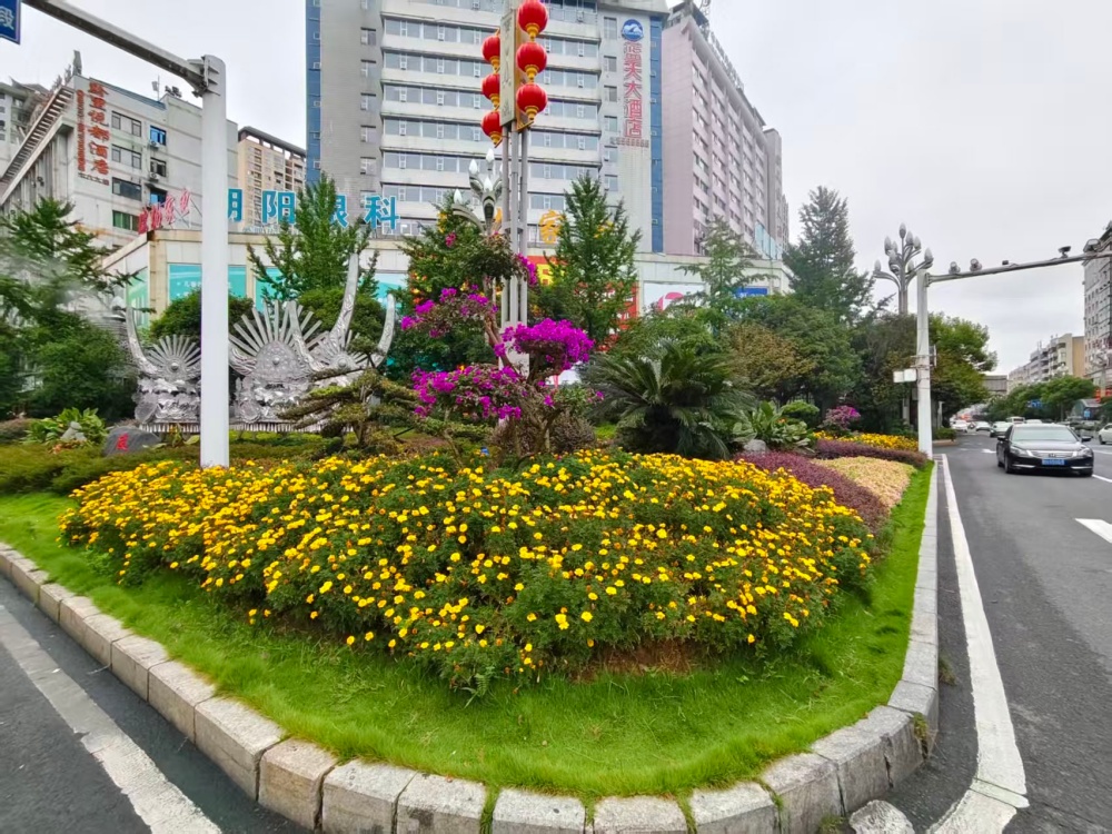 在大十字路口、万博广场、行政中心广场等地,万寿菊、千日红、百日草等10000株色彩斑斓的花卉竞相绽放,与新增的3块国庆主题展板相映成趣,提前点燃了节日的热烈气氛。
