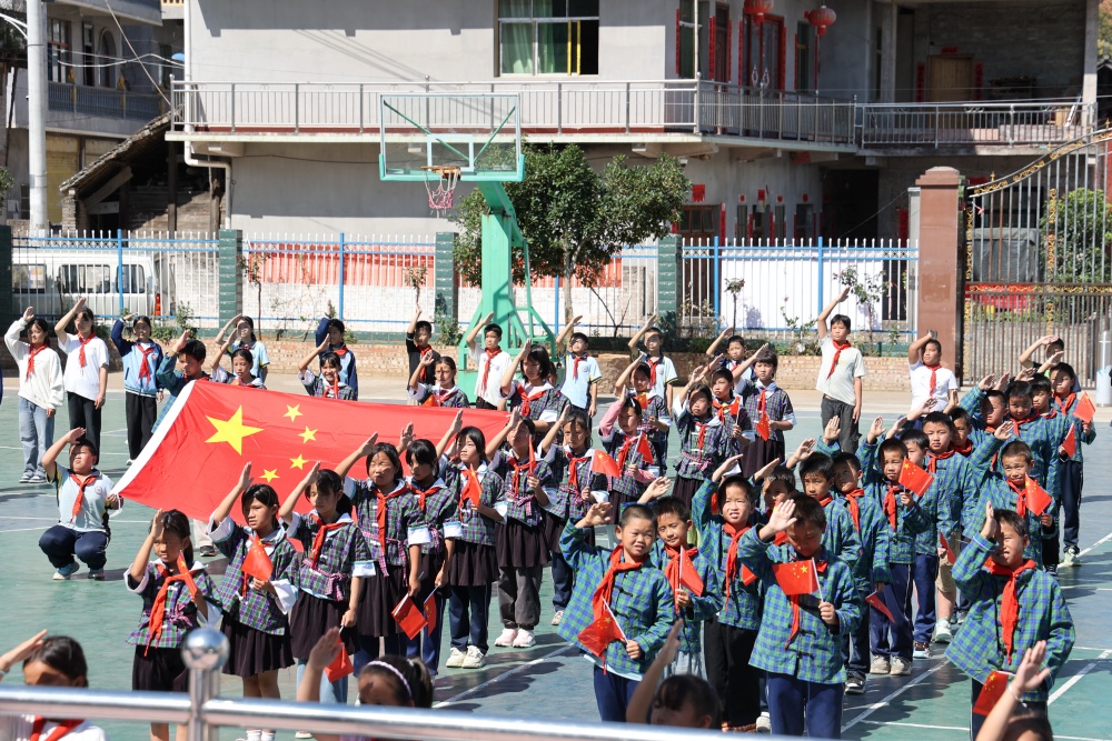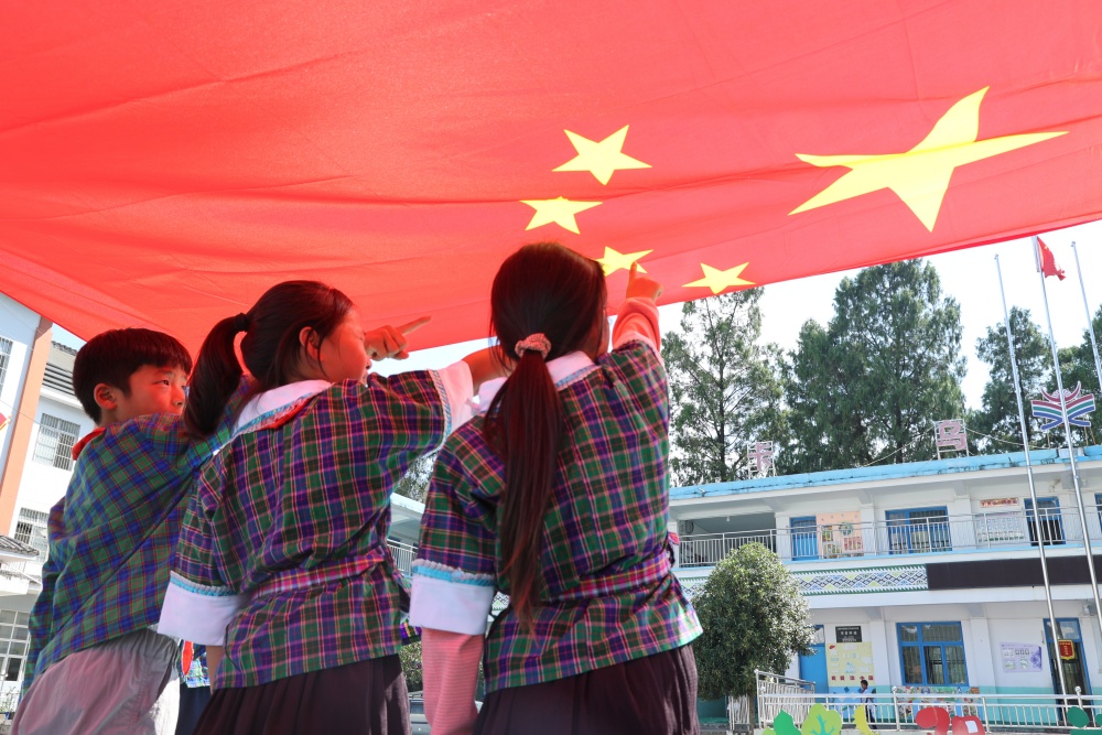 在宣威镇卡乌小学,孩子们穿着苗族服装,精神振奋、目光如炬,激昂地齐声高唱国歌,为祖国母亲献上最真挚的祝福。