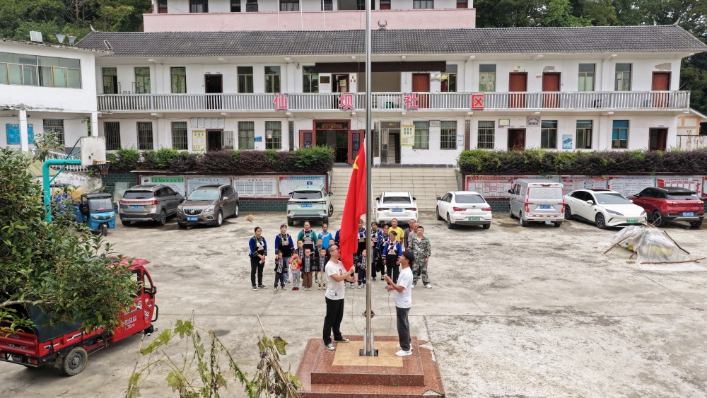 在金竹街道仙坝村,鲜艳的五星红旗冉冉升起,村干部和当地的畲族同胞身着民族盛装,目光坚定,随着五星红旗缓缓移动,用心感受这一庄严而神圣的时刻。
