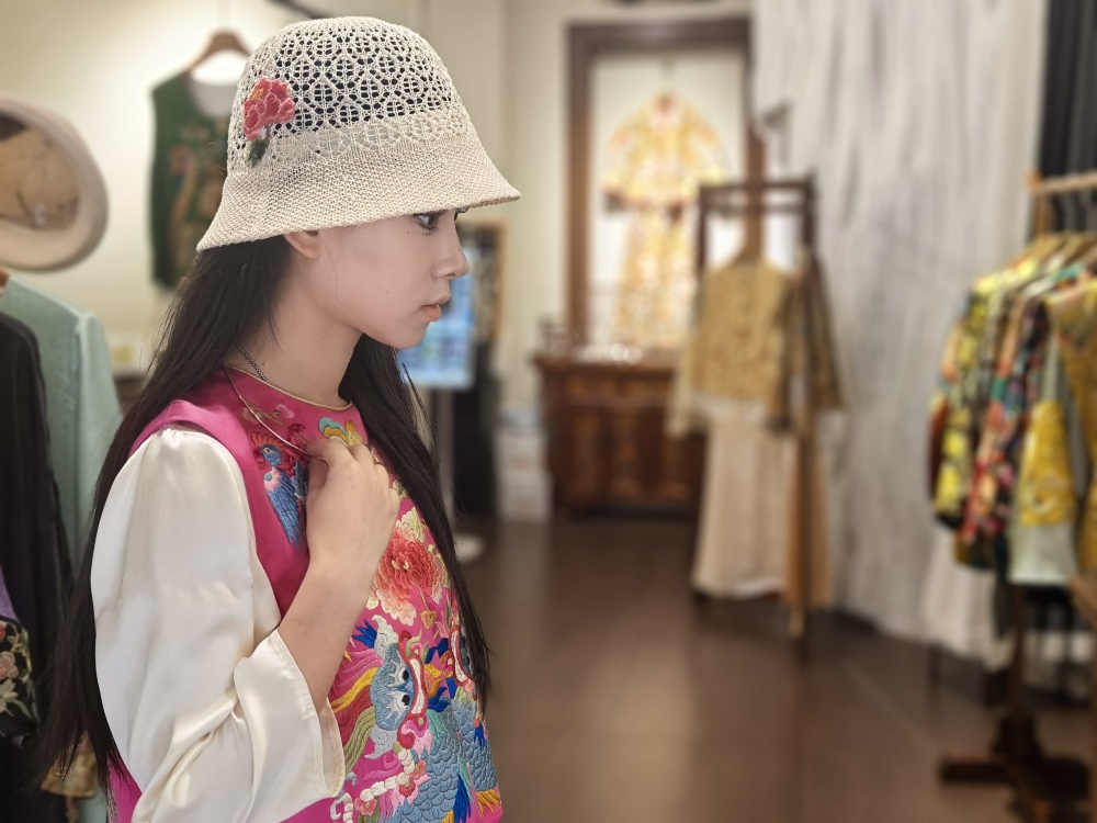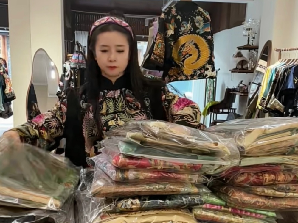 在绣里淘非遗集市里,阿朵苗绣店成为游客们慕名打卡的热门之地。这家经营了30年的老店,承载着三代人的心血与传承。店主阿朵出生于1977年,十多岁便跟着母亲走南闯北做苗绣绣品生意。如今,他们家在传承传统苗绣的基础上大胆创新,将传统苗族绣片与新中式风格巧妙结合,打造出适合现代人各种场景穿着的精品时装。