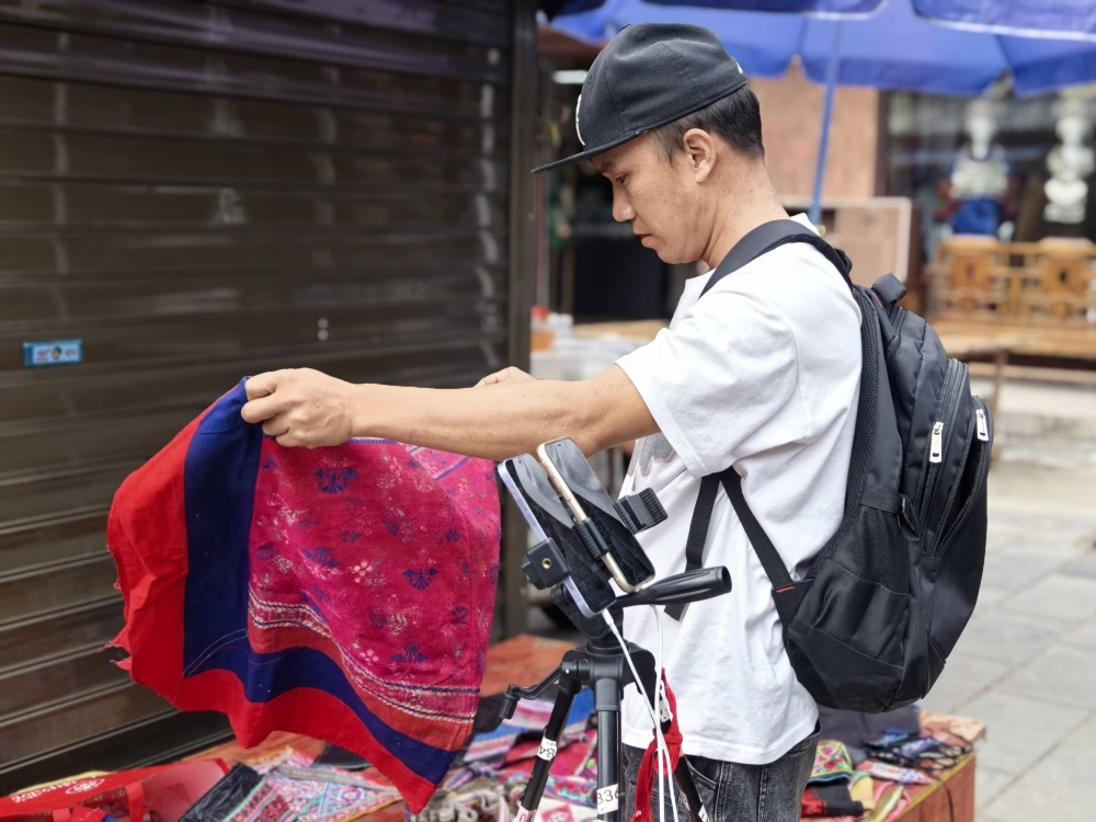 绣里淘非遗集市的火爆也吸引了像吴绍勇这样的创业者。半年前,曾在黎平县做网络直播的吴绍勇,看到“村T”直播带火了集市后,毅然来到绣里淘集市做主播带货。他依靠集市的人气和自身原有的流量,每天的销售额十分可观,多的时候能达到几千元甚至上万元。