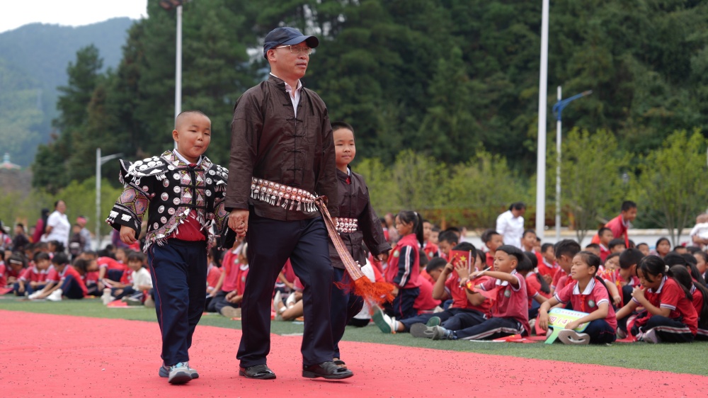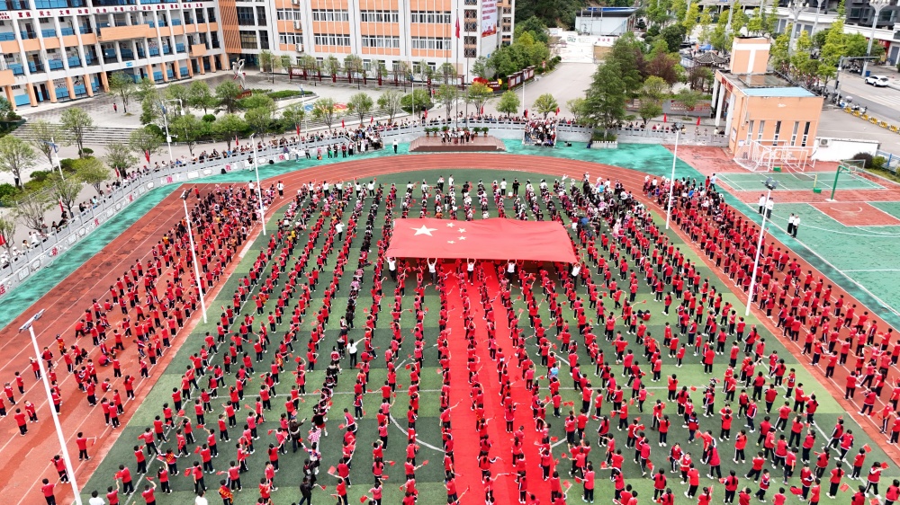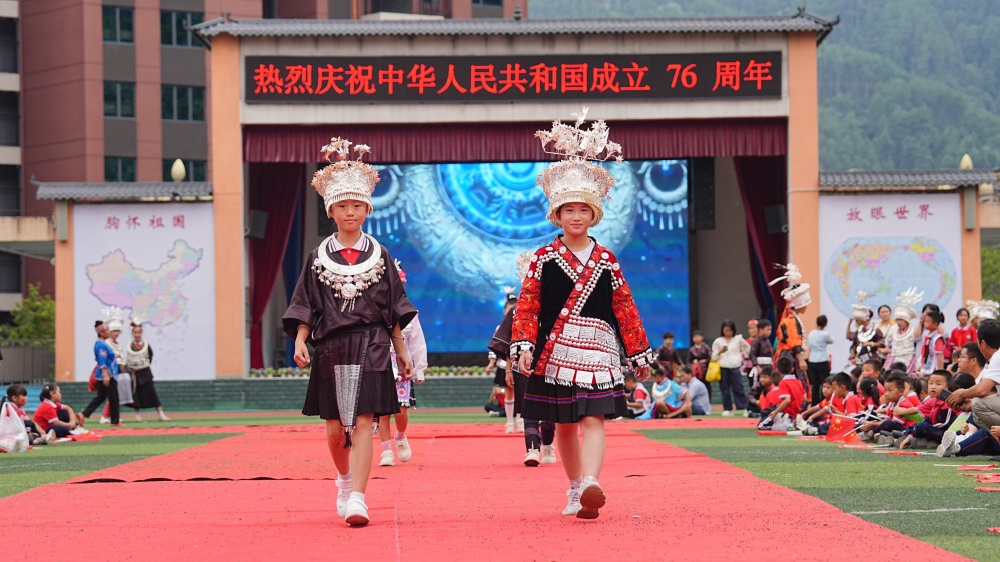 城关第五小学的操场上,充满激情的庆祝活动精彩上演。全体师生齐唱《我爱你中国》和《我和我的祖国》,嘹亮歌声响彻校园,传递对祖国的深切眷恋。一场别开生面的民族服饰走秀,更是将活动推向高潮:孩子们身着绚丽的民族服装,自信迈步、从容展示,尽显中华民族文化的多彩与厚重。“穿着我们的民族服饰参加国庆活动,特别骄傲!”参与走秀的学生姜姿润笑容灿烂,“祝伟大的祖国繁荣昌盛、国泰民安!”